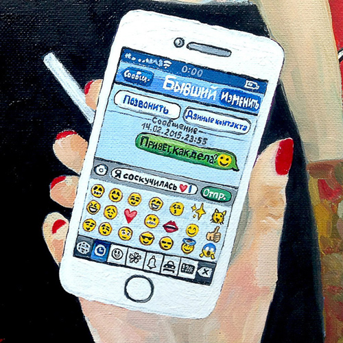 — Я рисовала разное. Был момент, когда знакомые делали выставки, и под выставки я рисовала что-то под конкретную тему. Причем серия «Гаджетизация» пошла раньше, чем портреты, года с 2015-го. Тогда еще не появились образы, где люди обнимаются, но смотрят в гаджеты, однако такая волна была — за какие-то пару лет произошла перестройка, перестроилась совсем коммуникация. Когда я начинала, все эти мессенджеры только вошли в обиход, в основном все общались во «ВКонтакте».
