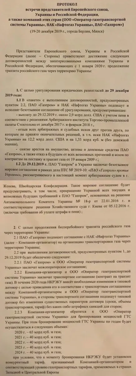 20 декабря переговоры продолжились, только теперь местом встречи стал Минск. И эта встреча стала прорывной. По ее итогам представители России и Украины подписали протокол нового соглашения о транзите, а также об урегулировании взаимных споров.