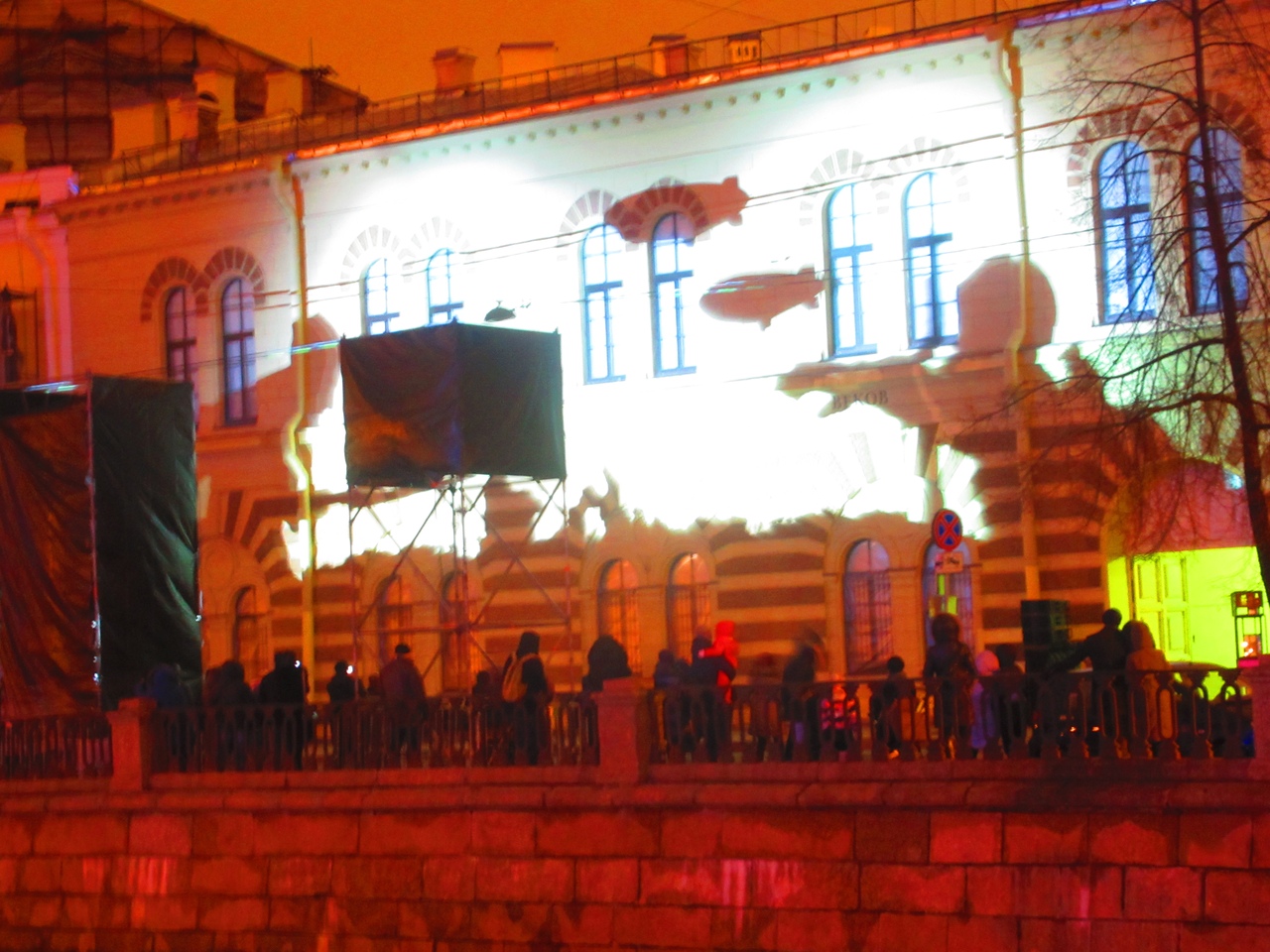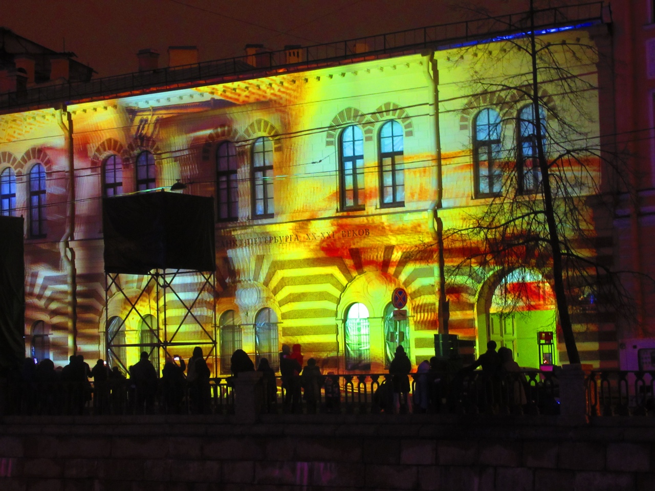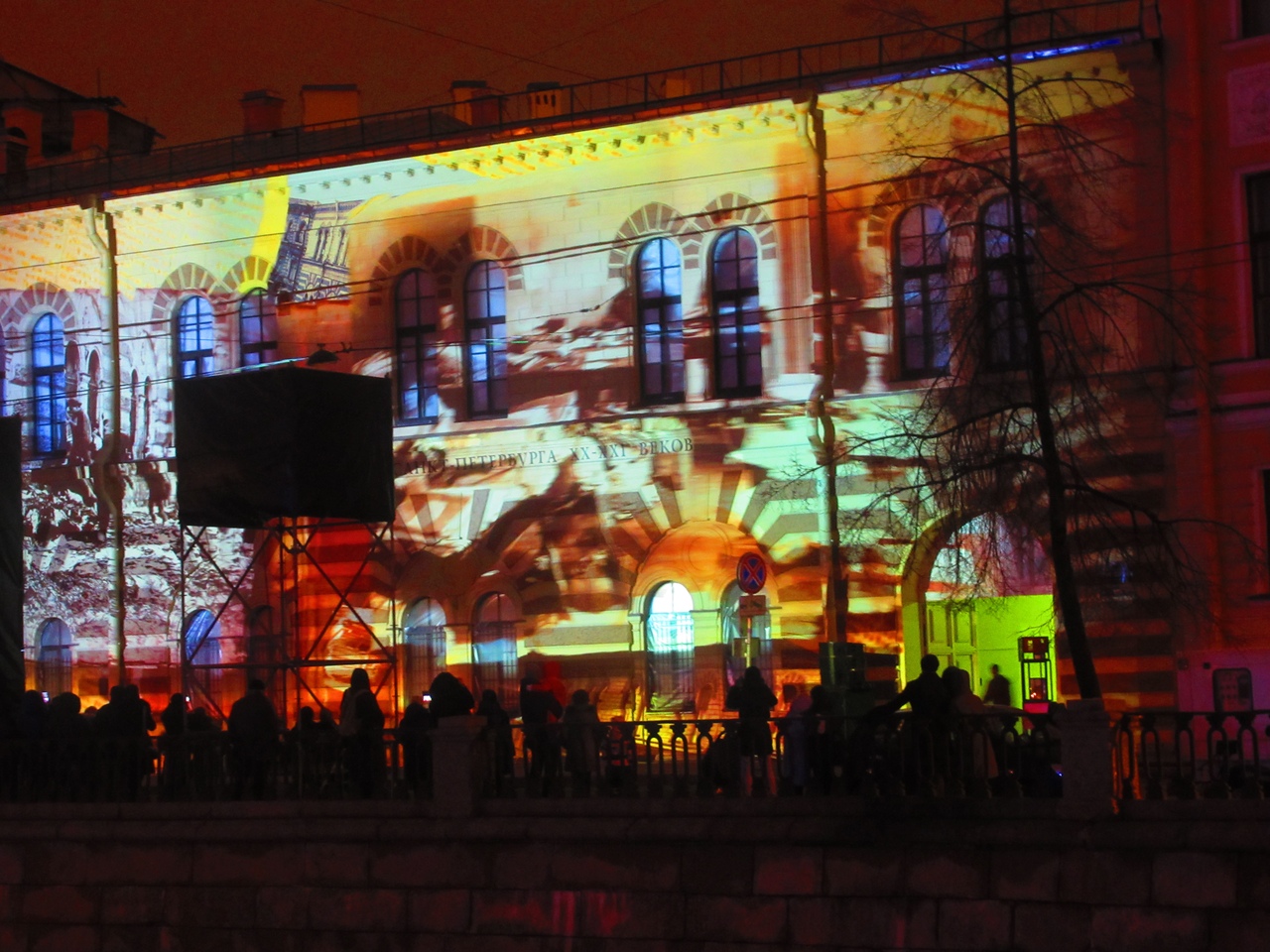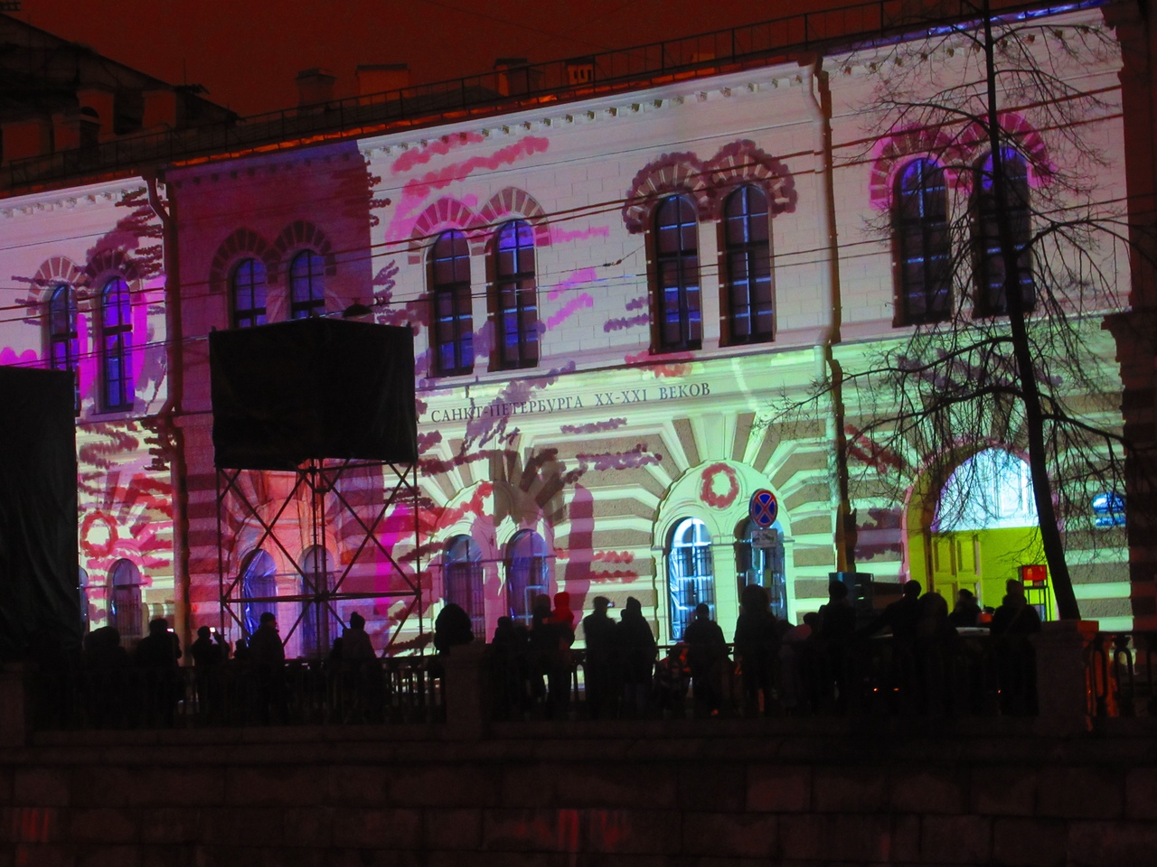 Вечером 21 декабря на фасаде основного здания Музея искусства Петербурга XX-XXI веков в честь четвертого дня рождения музея показали мультимедийное шоу «Сквозь время и искусство». На стену проецировали произведения искусства из коллекции музея так, чтобы они сложились в видеоряд, рассказывающий историю Петербурга за два последних века.