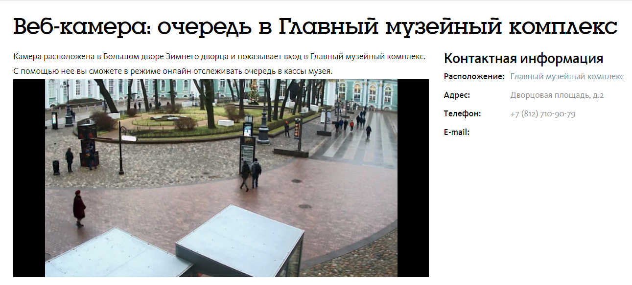В Большом дворе Зимнего дворца установили веб-камеру, которая в режиме онлайн показывает вход в Главный музейный комплекс. С помощью нее можно отслеживать очередь в кассы музея и рассчитать время посещения.