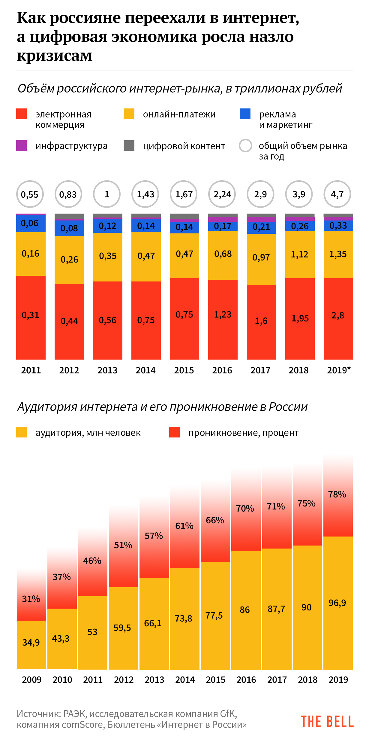 Объем российского интернет-рынка (его уже девять лет оценивает Российская ассоциация электронных коммуникаций — РАЭК) вырос с примерно 500 млрд рублей в 2011 году до 4,7 трлн рублей в 2019-м, то есть почти в 10 раз.