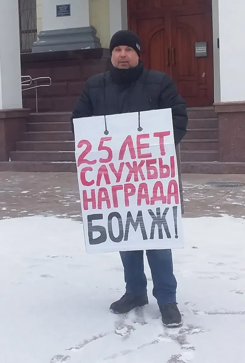 К зданию УМВД по Тюменской области подходит мужчина в черной куртке и синих штанах. Он накидывает на себя двустороннюю табличку, с одной стороны которой написано «25 лет службы. Награда — бомж», а с другой — «С детьми на улицу. Конституция РФ отдыхает». Это пенсионер МВД Роман Функ, бывший сотрудник ППС, старший прапорщик.