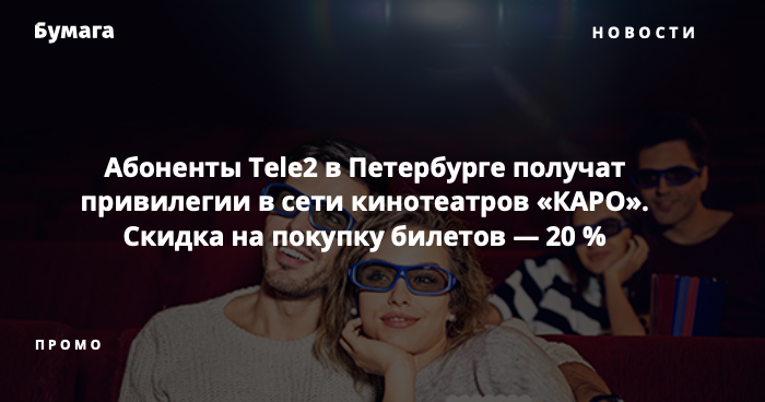 Вместе с сетью кинотеатров «КАРО» оператор с 25 декабря запускает уникальное предложение в Москве и Санкт-Петербурге – теперь приобрести билет на все фильмы сети можно со скидкой 20%.