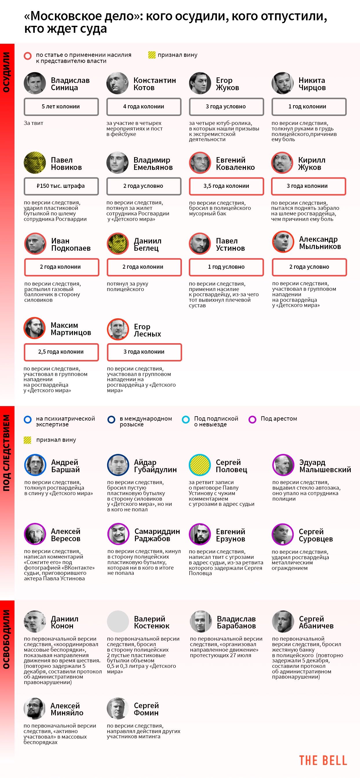 Раджабов и Суровцев были последними фигурантами «московского дела», ожидавшими наказания в СИЗО. Остальные подследственные либо под домашним арестом, либо под подпиской о невыезде, либо в международном розыске, а один — проходит психиатрическую экспертизу.