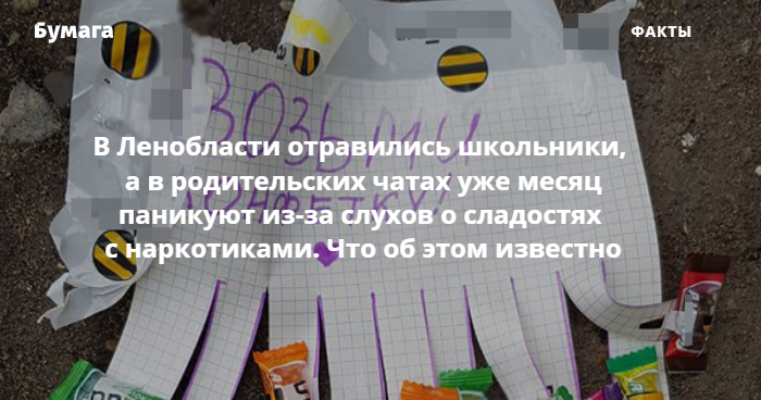 В деревне Гарболово в Ленобласти госпитализировали нескольких шестиклассников — они говорят, что им стало плохо после конфет, которые принес один из учеников. Чем отравились дети неизвестно, однако в родительских чатах и соцсетях уже месяц распространяют неподтвержденную информацию о том, что школьникам предлагают наркотики и снюс под видом конфет. В одном из лицеев Петербурга на фоне новостей поручили провести собрания по «технике безопасности».