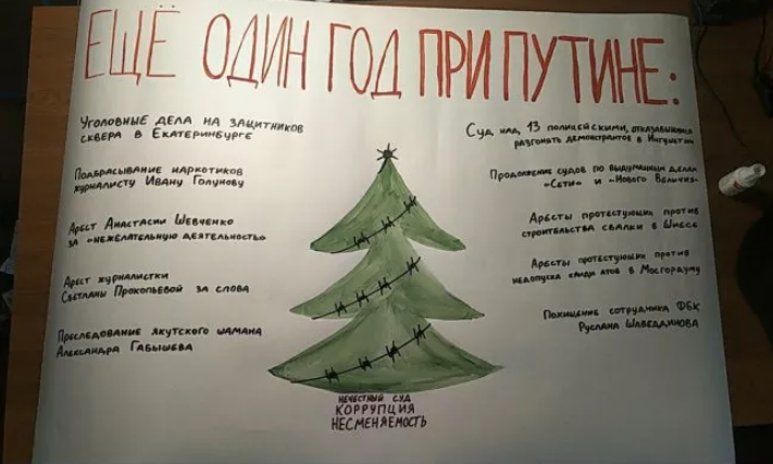 На плакате активист перечислил людей, которых в 2019 году преследовали силовики. Например, он упомянул дела против журналиста-расследователя Ивана Голунова и бывшего члена «Открытой Роccии» Анастасии Шевченко, похищение сотрудника ФБК Руслана Шаведдинова и аресты участников акций против недопуска независимых кандидатов в депутаты на выборы в Мосгордуму.