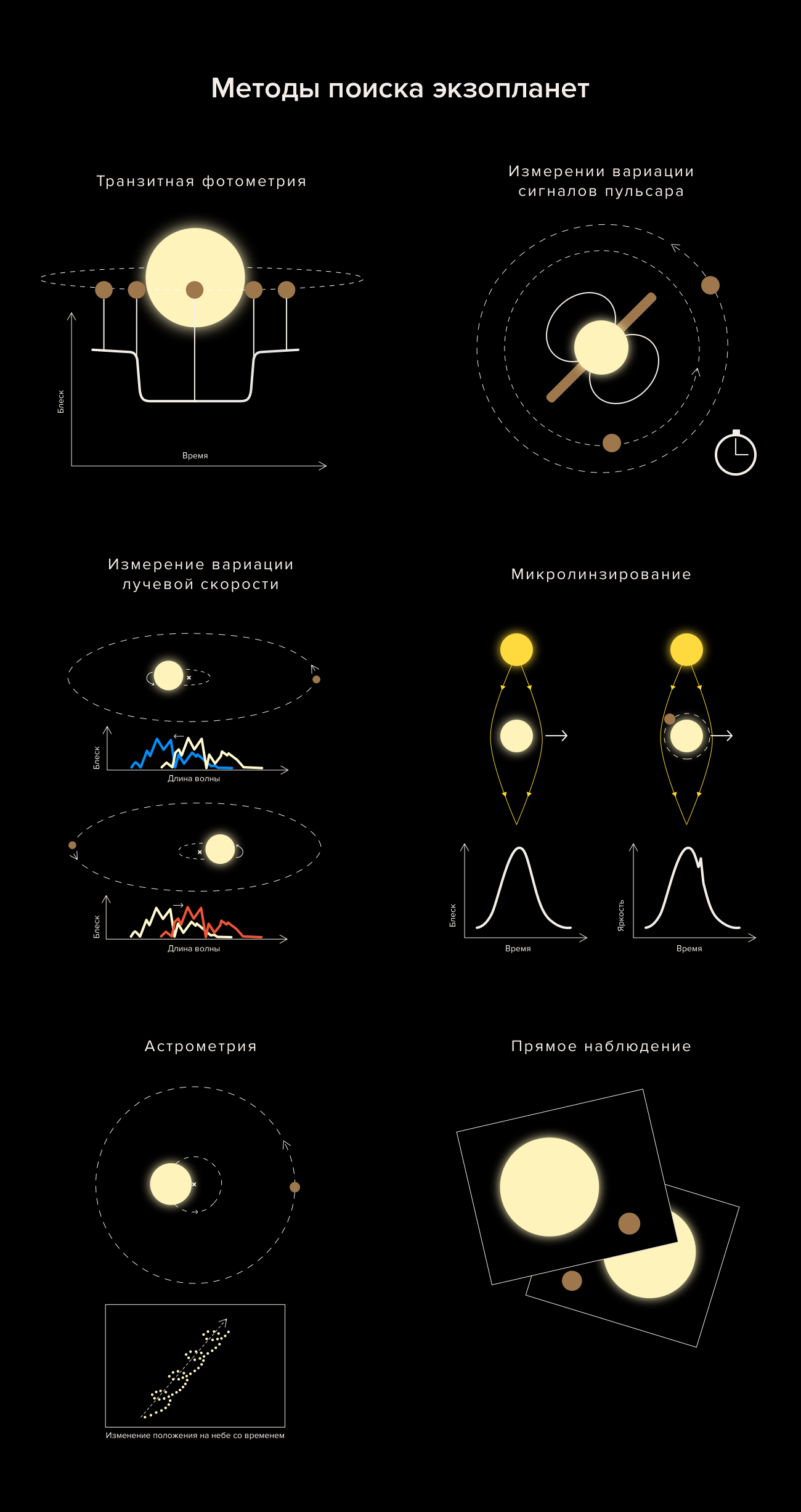 Основных методов поиска экзопланет шесть, и все они до сих пор используются и имеют свою сферу применения. Самый прямой путь — это просто увидеть экзопланету — получить снимок и ткнуть пальцем в точку, сказав: «Вот она!». Как можно догадаться, сделать это удается крайне редко. Из нескольких тысяч известных экзопланет лишь в нескольких случаях удается заснять далекое тело непосредственно. Еще иногда можно выделить излучение планеты в совместном потоке фотонов от звезды и всего, что ее окружает. Но чаще данные по планетам существенно менее прямолинейны, хотя от этого они не становятся менее надежными.