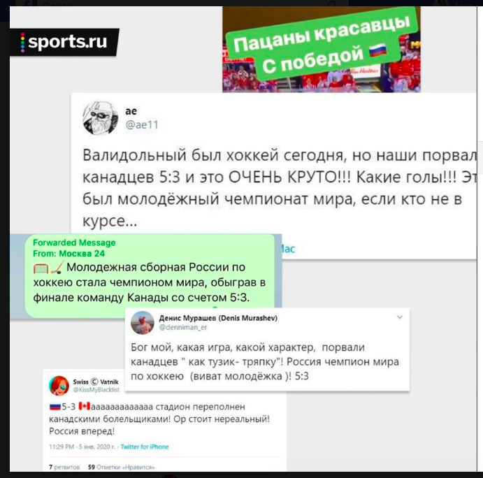 «Сейчас куча людей, включая футболиста Тарасова, smm-щика «Москва 24» или депутата Дегтярева убеждены, что Россия выиграла, и ликуют в соцсетях», – добавил журналист.