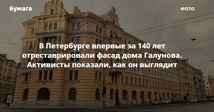 «Российская газета» называет фасады дома Галунова самым крупным и дорогим объектом реставрации в Петербурге в 2019 году.