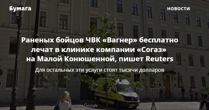 Reuters рассказывает, что «Согаз» по контракту с российскими ведомствами страхует жизнь и здоровье служащих российской армии и национальной гвардии, но не сотрудников ЧВК. При этом, как отмечает издание, по закону медицинские учреждения обязаны сообщать в полицию, если к ним поступают пациенты с травмами насильственного характера. Делает ли это персонал петербургской клиники, неизвестно.