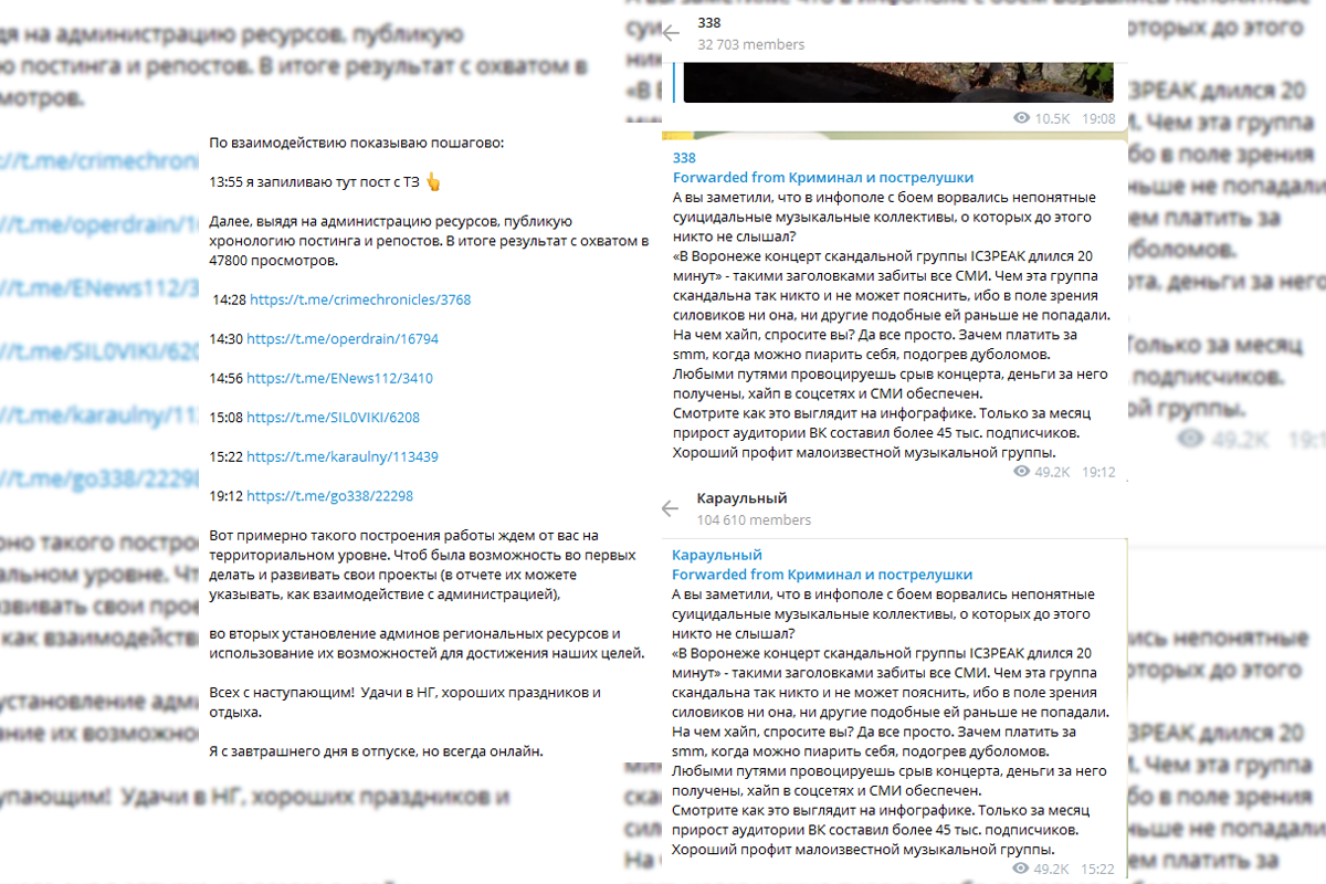 Одно из последних поручений «Трифонова» в выложенной переписке связано с преследованием группы IC3PEAK в их всероссийском туре в конце 2018 года. 8 декабря «полковник» попросил коллег «подать информацию», что задержания музыкантов провоцируют они сами — ради поднятия рейтинга и хайпа. В течение дня в нескольких анонимных телеграм-каналах появилось одно и то же сообщение — перепост уже удаленного поста из канала «Криминал и пострелушки». «На чем хайп, спросите вы? Да все просто. Зачем платить за smm, когда можно пиарить себя, подогрев дуболомов. Любыми путями провоцируешь срыв концерта, деньги за него получены, хайп в соцсетях и СМИ обеспечен», — пишет аноним. Выполнение этой задачи «Трифонову» понравилось.