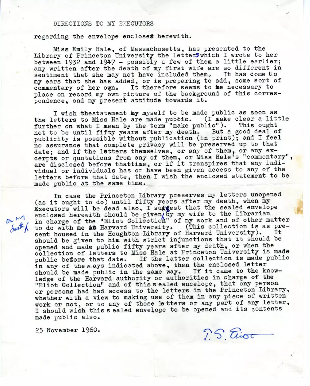 Сам поэт был очень недоволен решением Хэйл передать архив университету. Он написал официальное заявление — которое попросил распространить в тот же день, когда будут обнародованы письма. Теперь это заявление также опубликовано — и, в отличие от писем, оно совсем не доброе и не сентиментальное. Элиот объясняет, что, познакомившись с Хэйл в 1912 году, влюбился в нее, затем женился на другой, семнадцать лет спустя с женой расстался. После смерти своей жены (она умерла в психиатрической клинике в 1947 году) Элиот понял, что вовсе не любит Эмили, с которой к тому времени много лет обменивался письмами. «Эмили Хейл убила бы во мне поэта. Вивьен сама чуть не довела меня до смерти, но поэт благодаря ей оставался в живых. Оглядываясь на ужасные семнадцать лет, прожитые с Вивьен, я понимаю, что лучше они, чем скучная судьба заурядного преподавателя философии, которая ждала бы меня, прими я другое решение». Следуют и другие неприятные подробности; в конце приписка от руки: «Письма Эмили Хейл ко мне были уничтожены моим коллегой по моей просьбе».