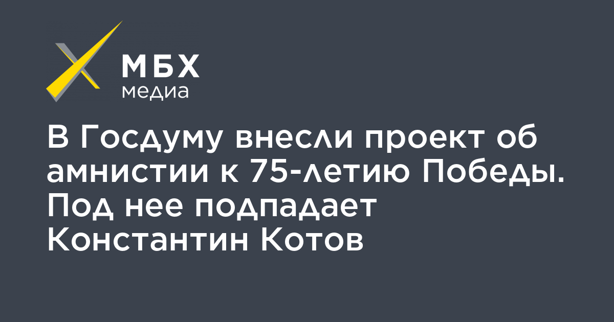 В Госдуму внесли проект постановления об амнистии заключенных к 75-летию Победы в Великой Отечественной Войне. Документ был опубликован на сайте нижней палаты парламента. Автор документа депутат Сергей Иванов сообщил «МБХ медиа», что под амнистию может попасть фигурант «московского дела» Константин Котов, осужденный по «дадинской статье».