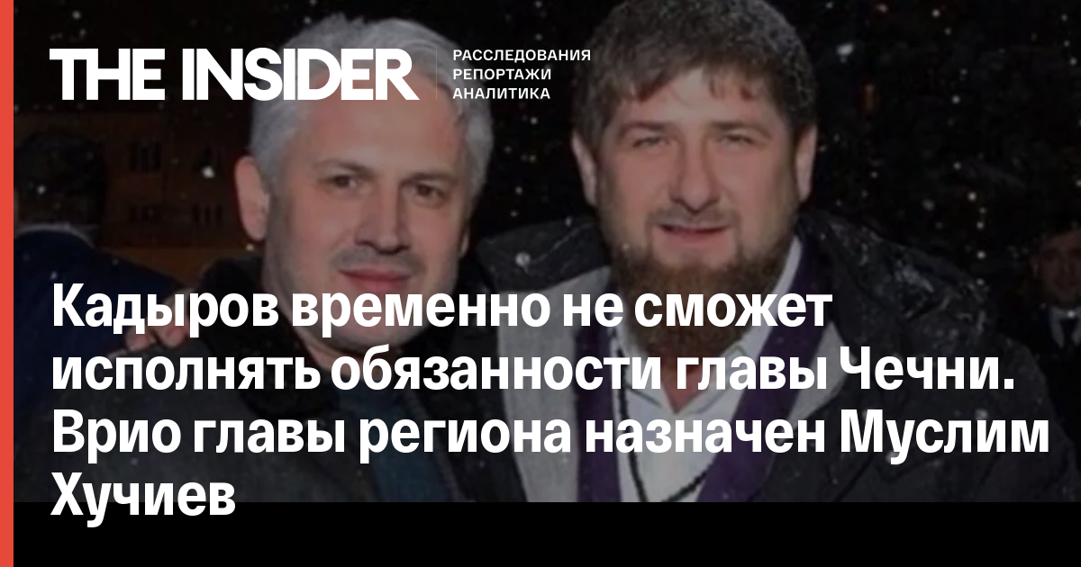 Кадыров временно не сможет исполнять обязанности главы Чечни. Врио главы региона назначен Муслим Хучиев