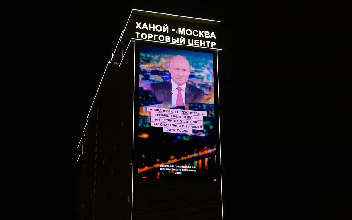 Трансляция послания президента Путина на здание в районе Тропарево-Никулино. Москва, 15 января 2019 года. Фото: РИА Новости