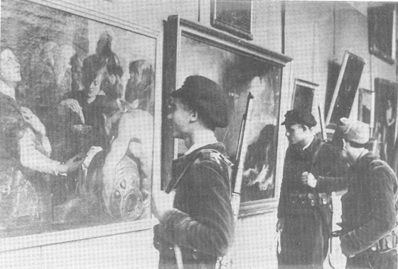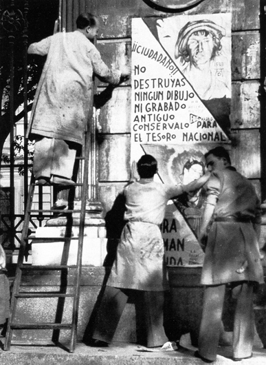 © Архив музея Прадо Студенты художественных училищ развешивают плакаты с призывом сохранять культурное достояние По призыву Комитета по охране достояния студенты художественных училищ создают иллюстрированные плакаты и расклеивают их по городу: «Искусство и культура взывают к твоей помощи, гражданин!», «Научись видеть в религиозном образе искусство. Помоги сохранить его!». Жителям Мадрида раздают листовки, Альянс антифашистской интеллигенции ведет уличную пропаганду. Республике необходимо пресечь акты вандализма и завоевать европейскую поддержку. В сентябре 1936 года главой Департамента изящных искусств назначен молодой художник-коммунист Жозеп Ренау, а директором Прадо — Пабло Пикассо. Будущий автор «Герники» принял почетную должность, но из Парижа не уехал, объясняя свое отсутствие тем, что «сейчас настоящие хранители музея — это авиаторы, танкисты и солдаты Народной армии, которые сражаются на подступах к Мадриду».