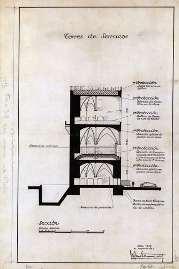 Чертеж шести уровней защиты, созданных в Торрес-де-Серранос в Валенсии для хранения картин из Прадо и других эвакуированных ценностей Наступление Франко на Мадрид было остановлено, но город подвергался постоянным бомбардировкам. Всю зиму продолжалась эвакуация (еще один аргумент — картинам не пережить холодной кастильской зимы, а гарантировать отопление невозможно). В апреле 1937 года Комитет по охране художественного достояния возглавил художник Тимотео Перес Рубио, «республиканский кабальеро», как называли его современники. В первом конвое, тщательно организованном под его руководством, в Валенсию отправились в числе прочих «Триумф Вакха» Веласкеса, «Три грации» Рубенса и первое издание «Дон Кихота» из Национальной библиотеки.
