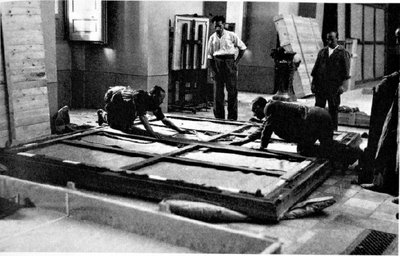 Упаковка картин Прадо в коробки В Валенсии для эвакуированных коллекций выделили церковь Коллегии патриарха и две массивные готические башни Торрес-де-Серранос. В то время как в Мадриде музейщики и техники из Комитета по охране художественного достояния разрабатывали оптимальную форму упаковки (ящики, распорки, подушки), Жозеп Ренау и архитектор Лино Ваамонде переоборудовали готику в современное бомбоубежище: шесть защитных слоев на верхних этажах, включая метровый слой упругой рисовой шелухи (в ход пошли местные ресурсы), трубы для циркуляции воздуха, перегородки для смягчения взрывной волны. Беспрецедентные в мировой практике исследования. Даже если башни обрушатся при бомбежке, картины под курганом из обломков не пострадают.