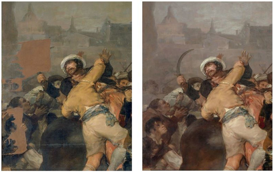«Бой с мамелюками 2 мая 1808 года в Мадриде» Франсиско Гойи. Фрагмент картины до реставрации 2008 года с затонированными фрагментами, утраченными во время повреждения картины в результате бомбардировки. И фрагмент после реставрации На выставке «Сон разума. Тень Гойи в современном искусстве» (куратор Олива Мария Рубио), открывшейся в конце 2019 года в мадридском Культурном центре Фернана Гомеса, художник Фернандо Санчес Кастильо представил инсталляцию из инфракрасных фотографий тех самых картин Гойи из Прадо, поврежденных во время эвакуации музея. Фотографии в натуральную величину сложены вместе, как холсты в кузове грузовика, — они стали одной черно-белой картиной, на которой видны все разрывы, трещины и утраты. Санчес Кастильо уверен, что «пигменты картин соприкасались и от удара перешли с холста на холст», а главное — что «инфракрасные лучи памяти» жизненно необходимы современному миру.