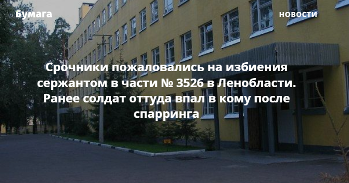 «Фонтанка» писала, что в части № 3526 в сентябре 2019 года срочник впал в кому. По версии командования части, это произошло после избиения офицером во время спарринга — испытаний перед контрактной службой. По словам знакомых срочника, у молодого человека был конфликт с командиром роты. Сейчас, по данным «Север.Реалии», срочник вышел из комы и «завершает лечение в больнице».