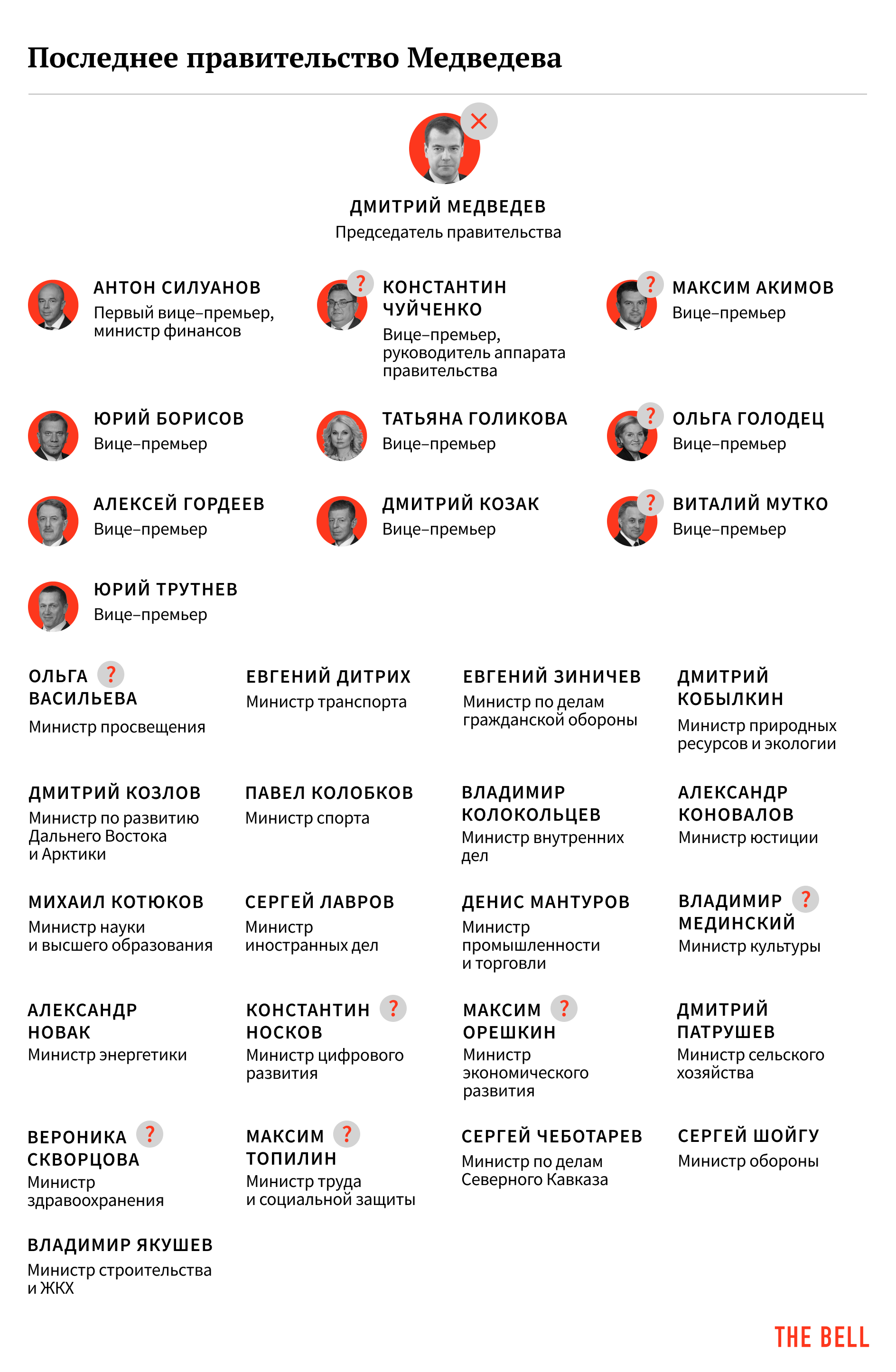 Прогнозы по поводу того, кого возьмут в команду Михаила Мишустина — главное развлечение на ближайшие дни. В пятницу новый премьер встретился со своим предшественником Дмитрием Медведевым и с другими членами правительства, ушедшего в отставку. Скорее всего, о новой структуре и составе правительства будет объявлено уже в начале следующей недели. Но предположений о том, кто в него попадет, а кто отправится в отставку — уже предостаточно: здесь — вся последняя информация от источников The Bell и из других СМИ.