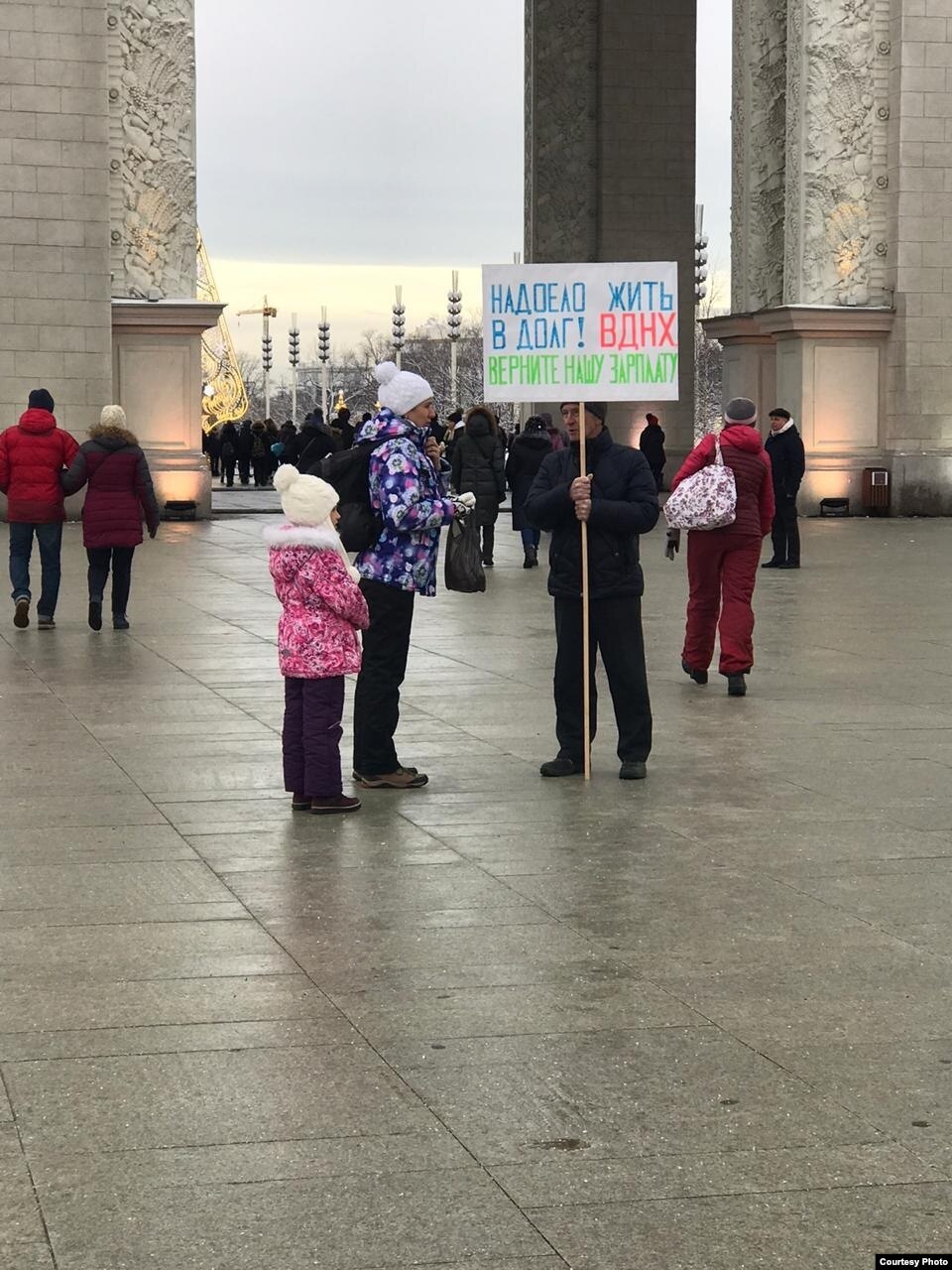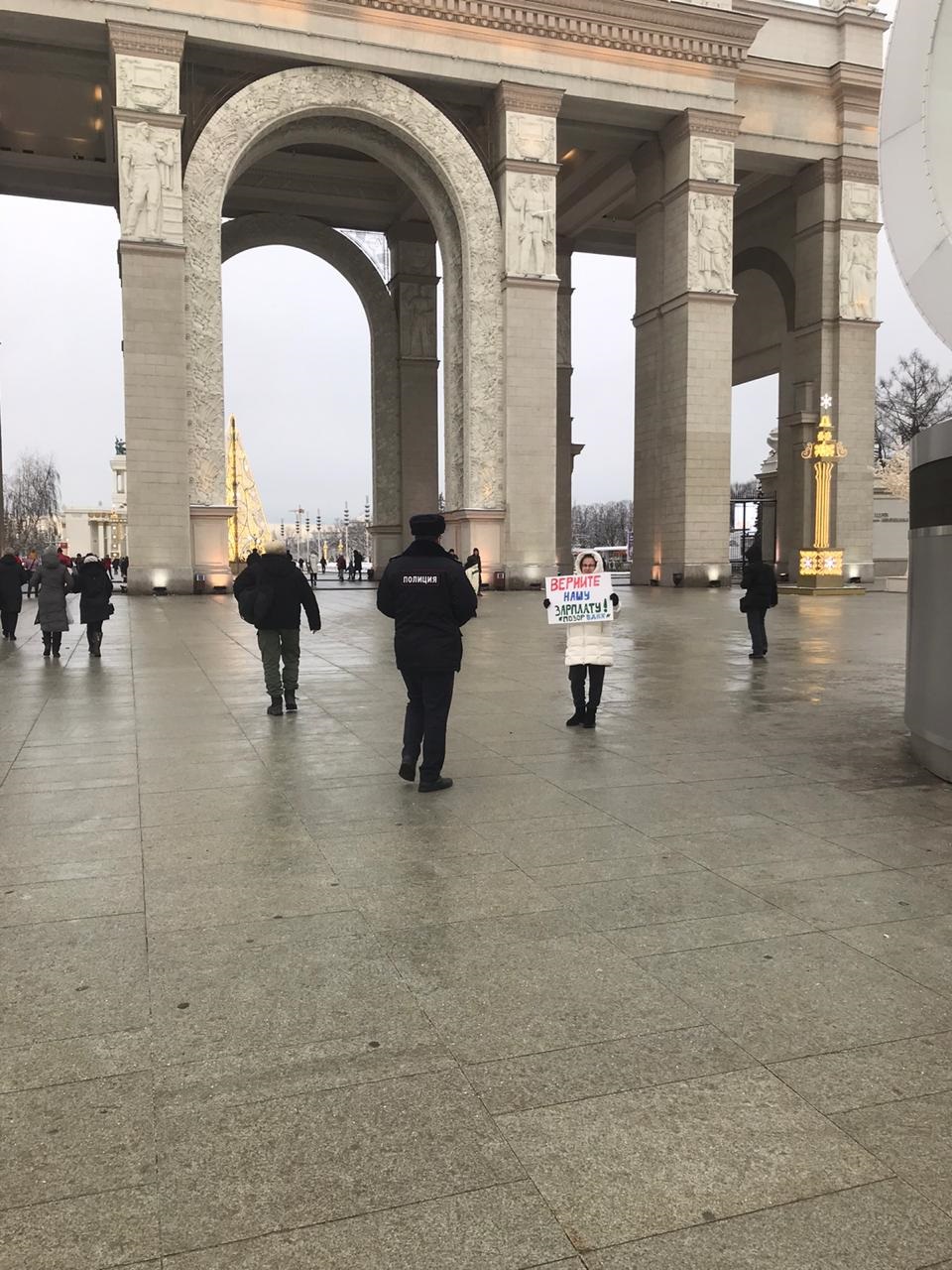 "Надоело жить в долг! ВДНХ, верните нашу зарплату" – один из лозунгов состоявшихся в минувшее воскресенье одиночных пикетов у центрального входа в бывшую витрину достижений советского хозяйства. Протесты экс-работников Хозяйственного управления (ХОЗУ) ВДНХ проходят с декабря.