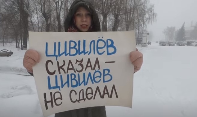 Пикетчики вышли на акцию с плакатами "Цивилев сказал – Цивилев не сделал". "Сейчас Диана Коробова вышла, а перед этим я выходил. Пытаемся привлечь внимание областных властей – в прошлом году нам удалось вытащить губернатора к нам посмотреть на подземный пожар. Он признал: "Здесь жить нельзя, переселяем", но дальше этого обещания ничего не сдвинулось, он больше ни разу к нам не приехал. Был замгубернатора – посмотрел на то, что при минусовой температуре у нас проталины на снегу и заявил, что пожары все потушили!", - сообщил Шестаков.