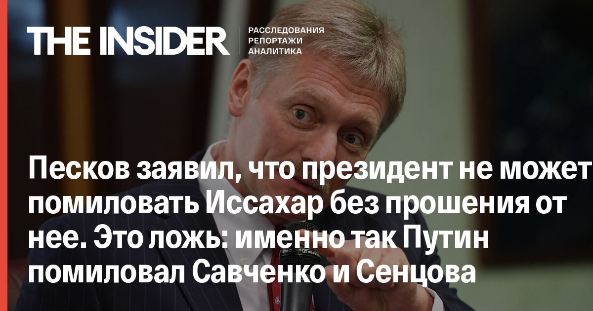 Песков заявил, что президент не может помиловать Иссахар без прошения от нее. Это ложь: именно так Путин помиловал Савченко и Сенцова