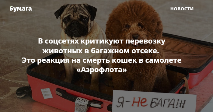 В инстаграме под хештегами #янебагаж, #животное не багаж, #янечемодан и #аэрофлот публикуют десятки постов с критикой российских правил перевозки животных в багажных отсеках самолетов. Так пользователи реагируют на смерть двух кошек в багажном отделении самолета «Аэрофлота».