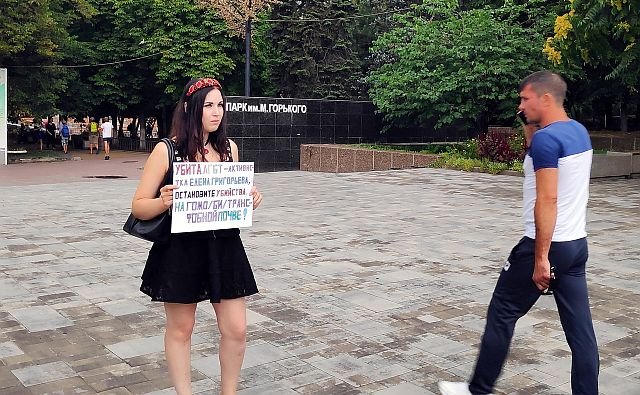 - 31 июля на Дворниченко во время одиночного пикета против насилия в отношении ЛГБТ напал неизвестный. Мужчина подошел к активистке и со словами «Долой Содом и Гоморру» распылил в лицо перцовый баллончик, а затем вырвал из рук плакат.