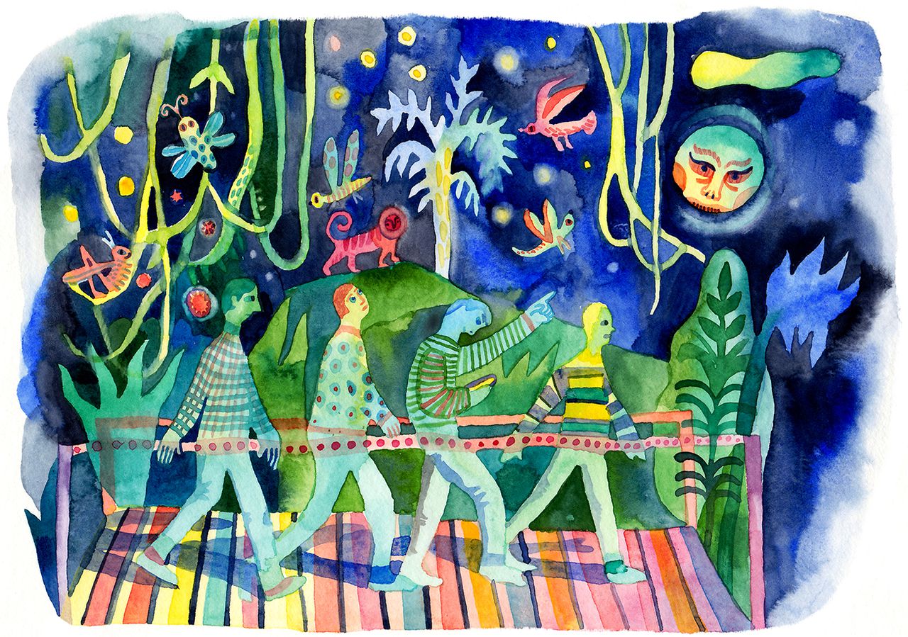 Ночь. Полная луна. Мы идём гуськом по утоптанной тропке между залитых водой рисовых полей. Зеркала полей упираются в абсолютно чёрное ничто. Это джунгли, слева и справа от тропы. Недоступные свету, но очень живые. Они стрекочут, рычат и воют на тысячу голосов. Мы не торопимся. Сегодня последний день, когда мы имеем право находиться в Пемако. У нас есть ещё два часа до полуночи, а до границы, подвесного моста через Брахмапутру, осталось совсем чуть-чуть. Хочется напоследок напитаться этим воздухом, этими звуками и жёлтой тропической луной.