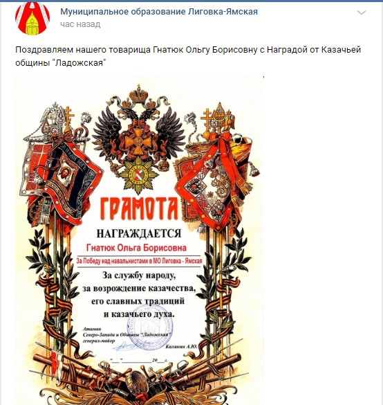 Казачье общество Ладожская гвардия вручила депутату совета Лиговка-Ямская в Петербурге грамоту "за победу над навальнистами". Фотография грамоты размешена в группе муниципального образования.