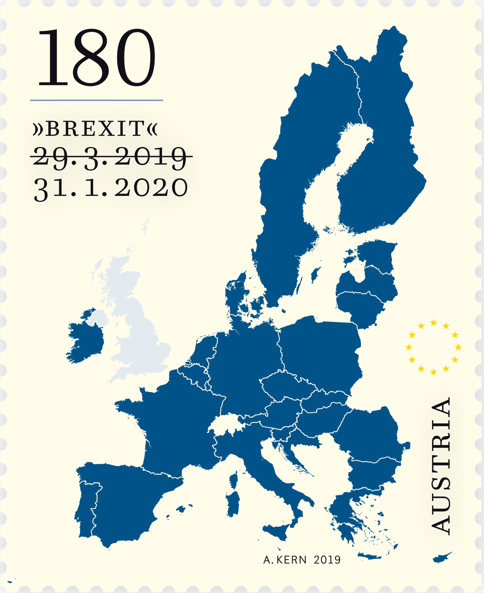 Österreichische Post Австрийская почта выпустила марку, посвященную выходу Великобритании из Евросоюза — Брекзиту. На марке изображена карта Европейского союза, причем Соединенное Королевство, в отличие от других стран ЕС, не темно-синего, а бледно-голубого цвета. Также на марке указаны две даты — запланированного и фактического выхода Великобритании из Евросоюза. 140-тысячный тираж марки австрийская почта планировала выпустить еще весной 2019 года, но точно неизвестно, был ли напечатан новый тираж с зачеркнутой датой или это старые марки с исправлением. Агентство Bloomberg описывает марку как «троллинг Брекзита». Марка стоит 1 евро 80 центов, ее можно купить в интернет-магазине Österreichische Post и в нескольких ее отделениях.