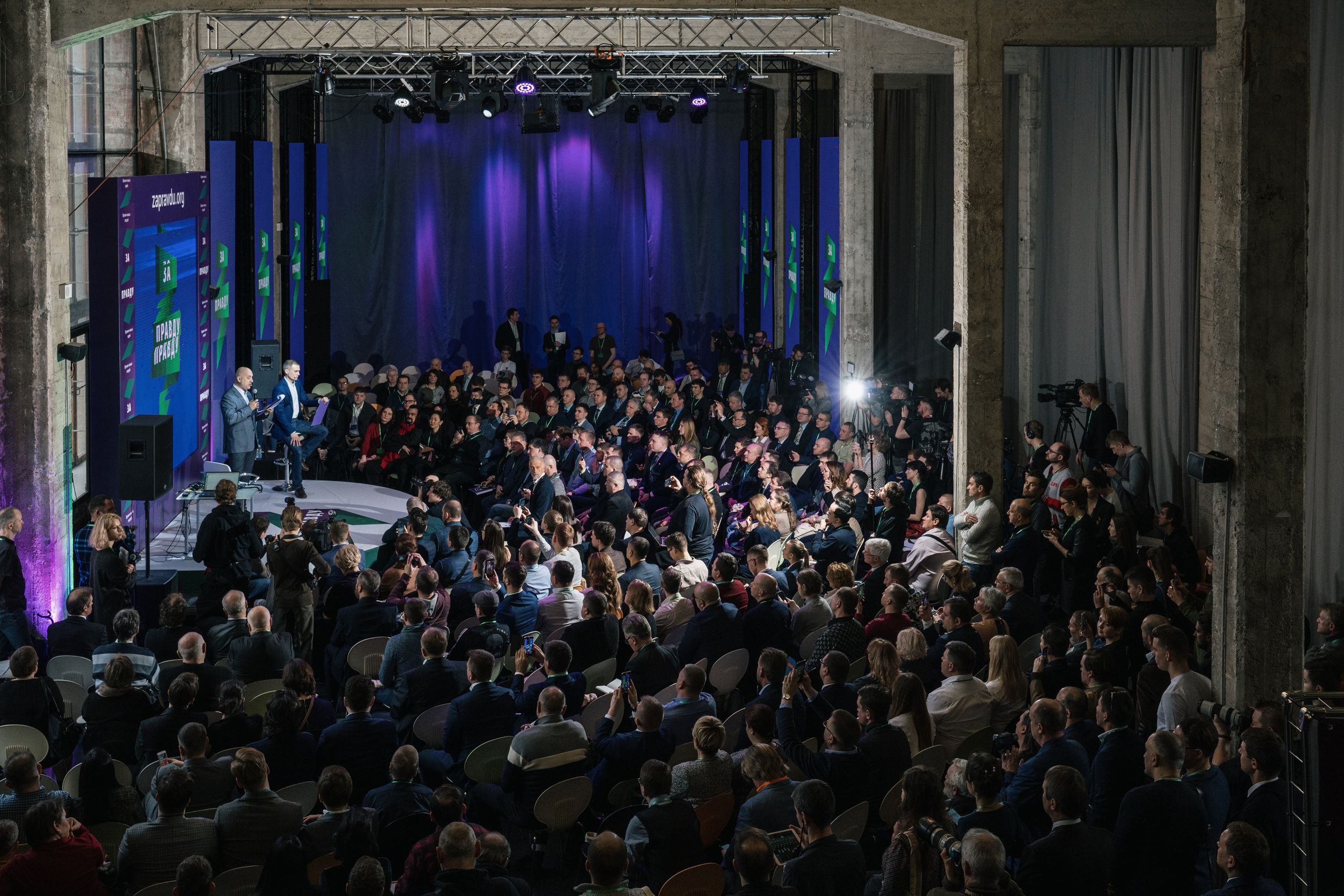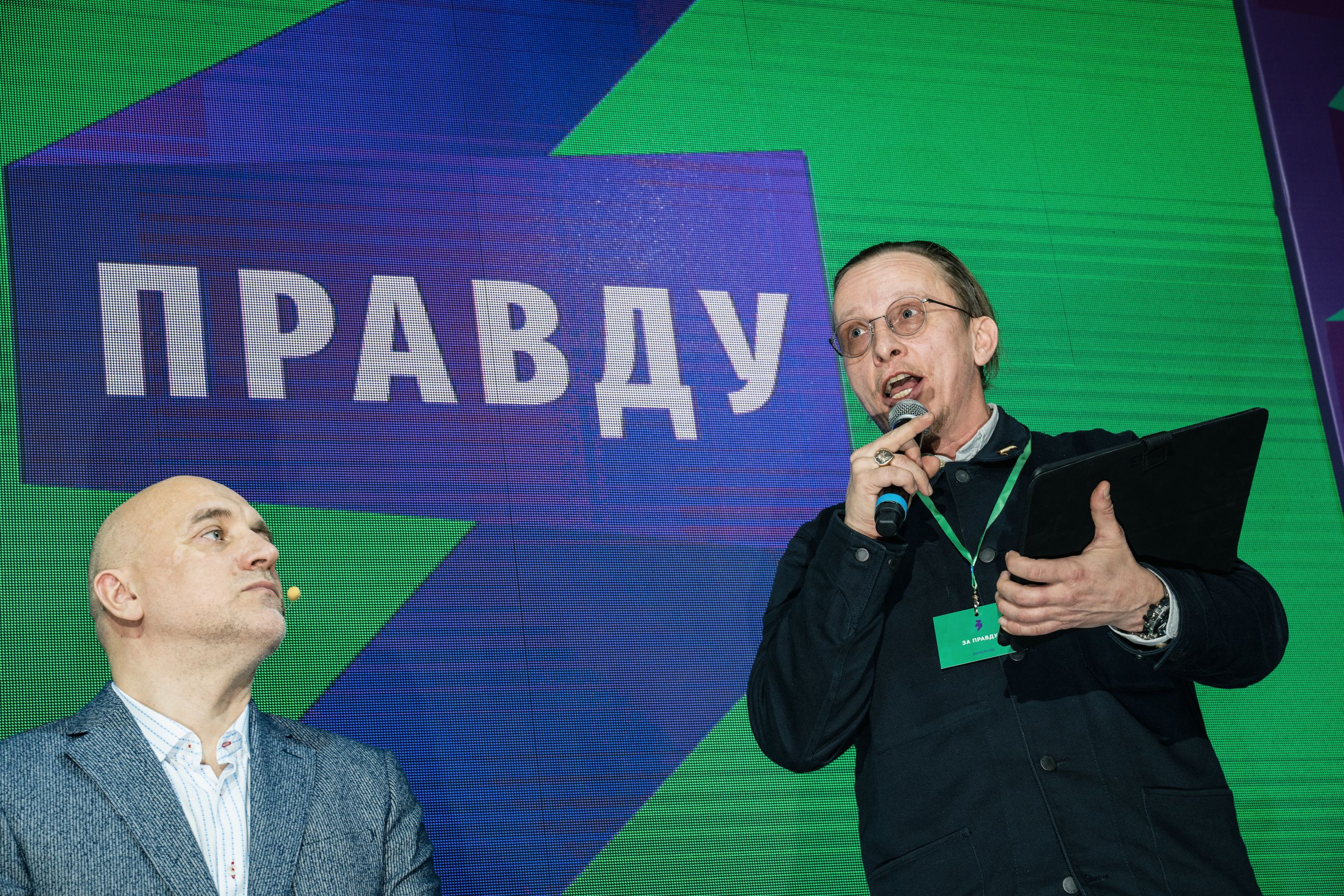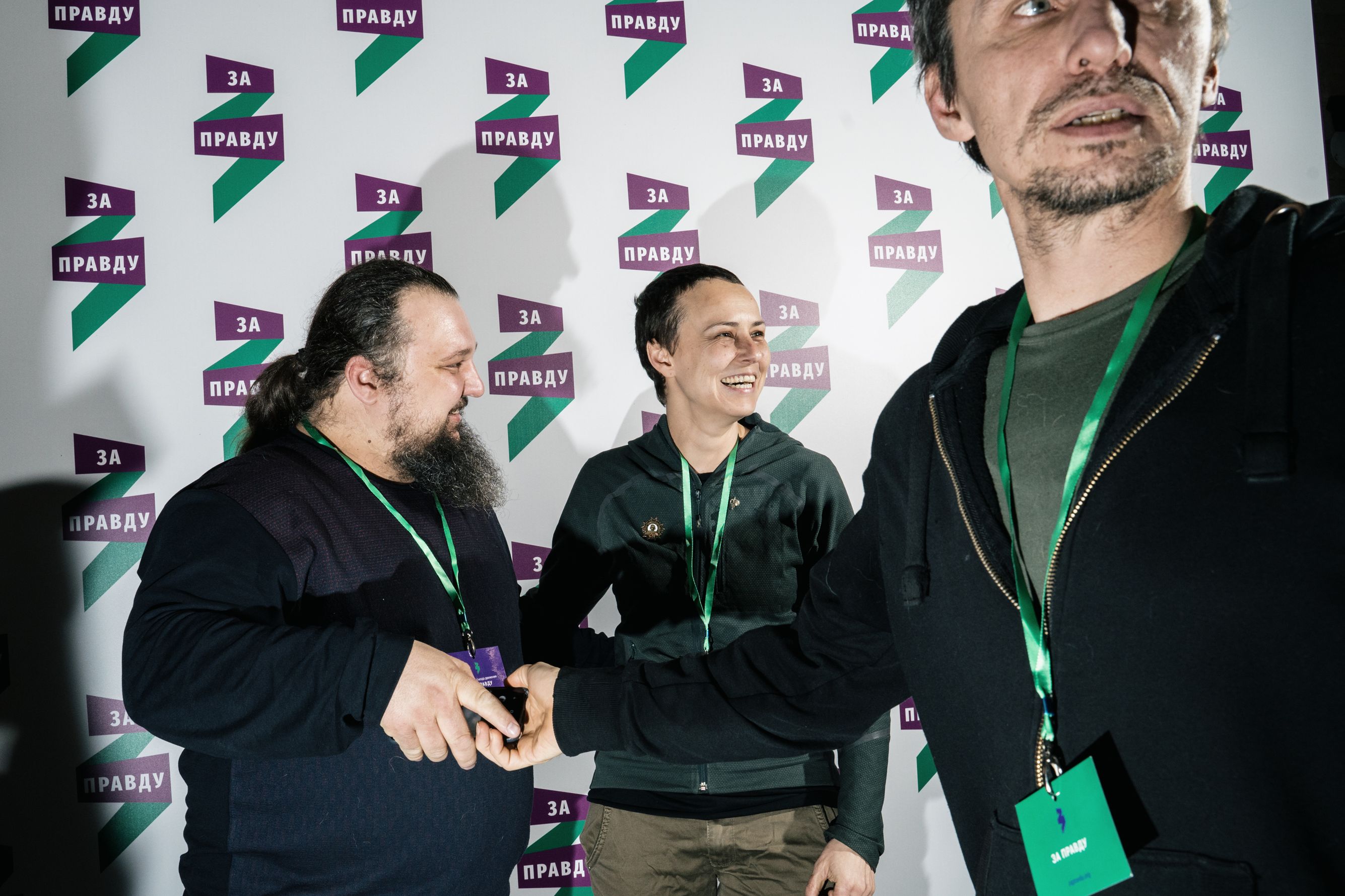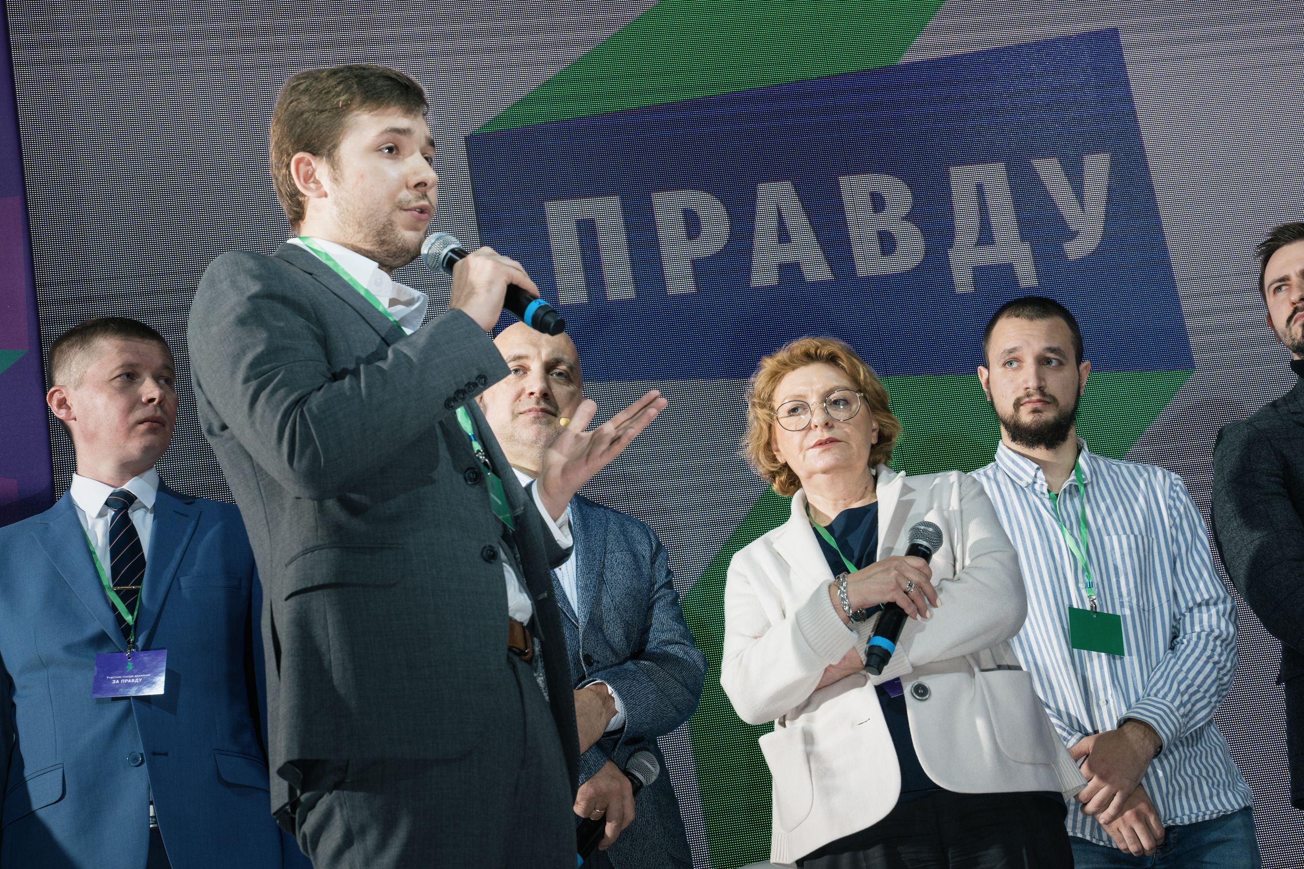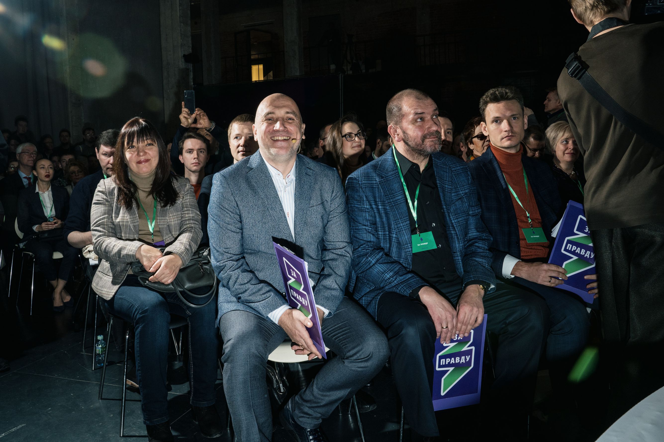 Во время кофе-брейков звучит лаунж, горят фиолетово-зеленые информационные стенды с QR-кодами (отсканировав, можно перейти на сайт движения), у участников — раздаточные материалы в хлопковых сумках, бейджи, папки — все в корпоративном стиле «За правду». Услужливые молодые люди в майках с партийным логотипом в виде зеленой ленты, сложенной в форме буквы «З», встречают гостей, пришедших в деловых костюмах и менее строгой офисной одежде.