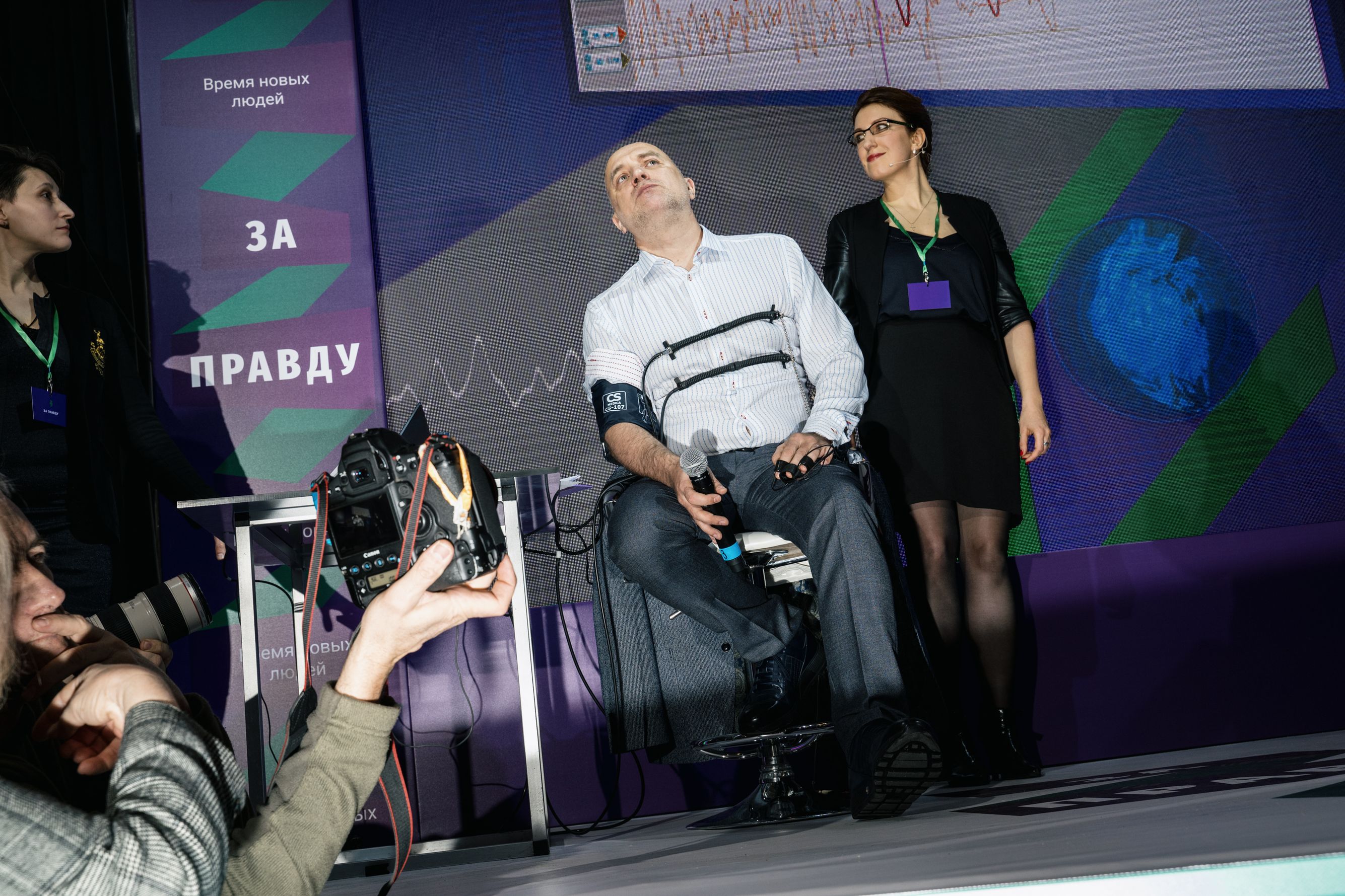 За Самойловым на сцену выходит Захар Прилепин. После вступительного слова он объявляет, что будет выступать, подключившись к полиграфу. И его действительно присоединяют к «детектору лжи» — показатели прибора выводятся на большой экран за сценой. Вопросы Прилепину задает его соратник — художественный руководитель МХАТ имени Горького Эдуард Бояков. Реакцию полиграфа на ответы политика восторженно комментирует короткими фразами женщина-полиграфолог. «Тема Конституции — очень важна для Захара!» — объясняет она. Или: «Видно, что за Донбасс у Захара сердце болит».
