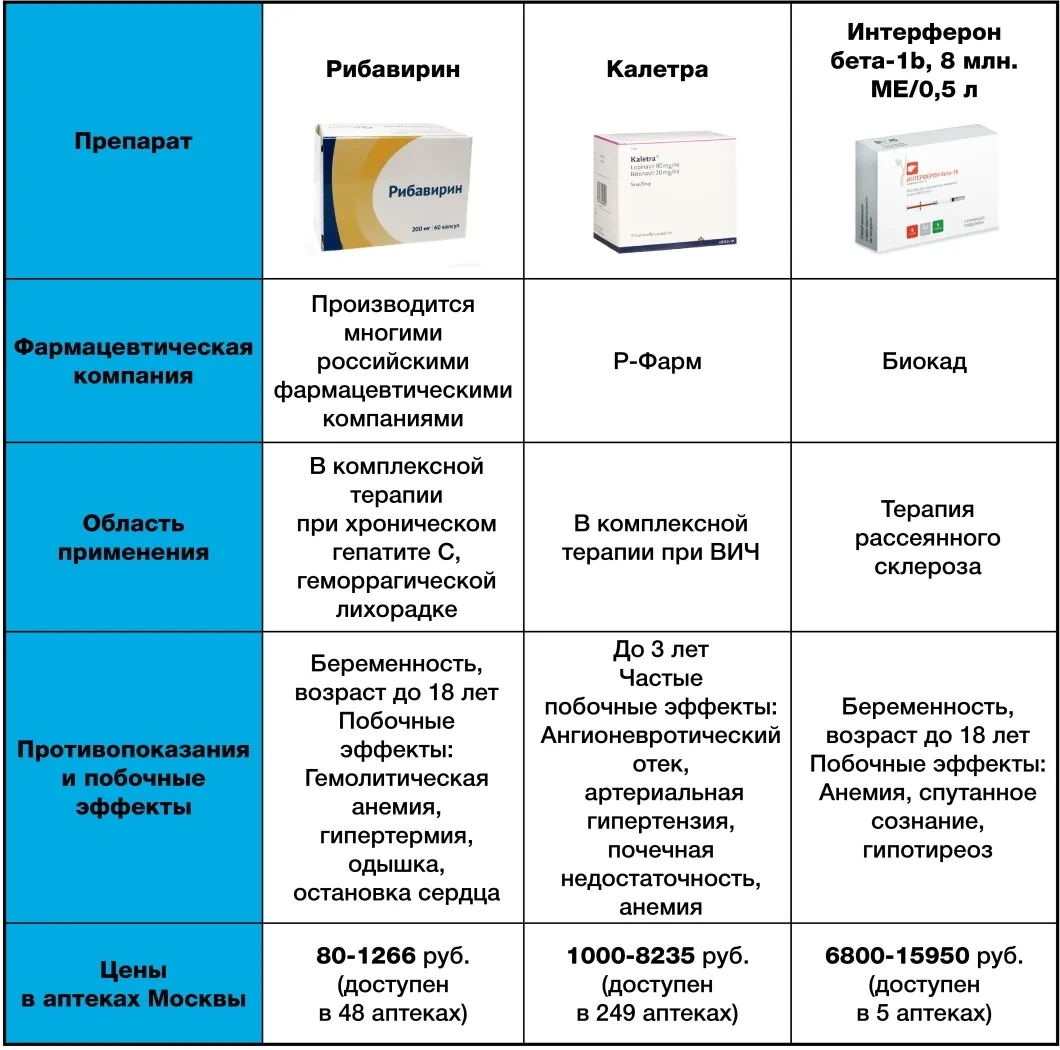 Применяемая в терапии ВИЧ «Калетра» (содержит 200 мг лопинавира и 50 мг ритонавира) и интерферон бета-1b в требуемой Минздравом дозировке 8 млн. МЕ также не являются безвредными. Каждый из них производит лишь одна фармацевтическая компания в России, причем они поставляются в основном в стационары для использования под постоянным контролем врачей.