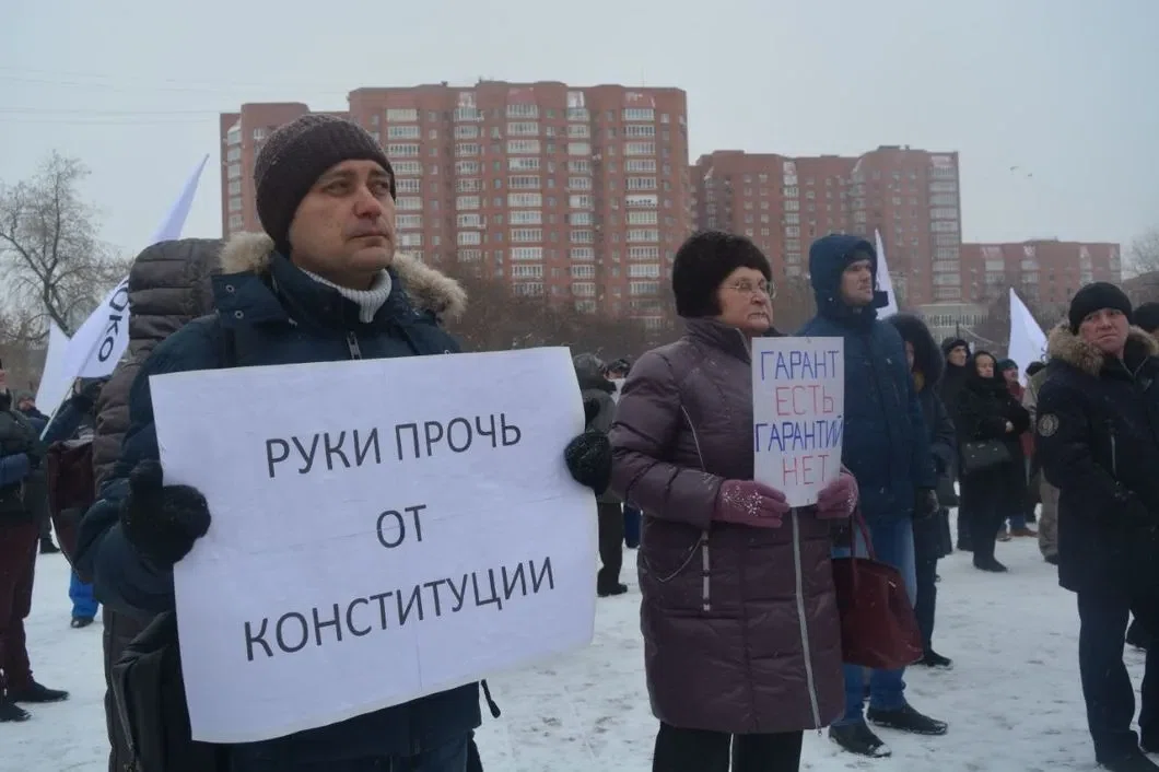 Собравшиеся держали в руках плакаты со следующими надписями: «Гарант есть, гарантий нет» и «Руки прочь от Конституции».