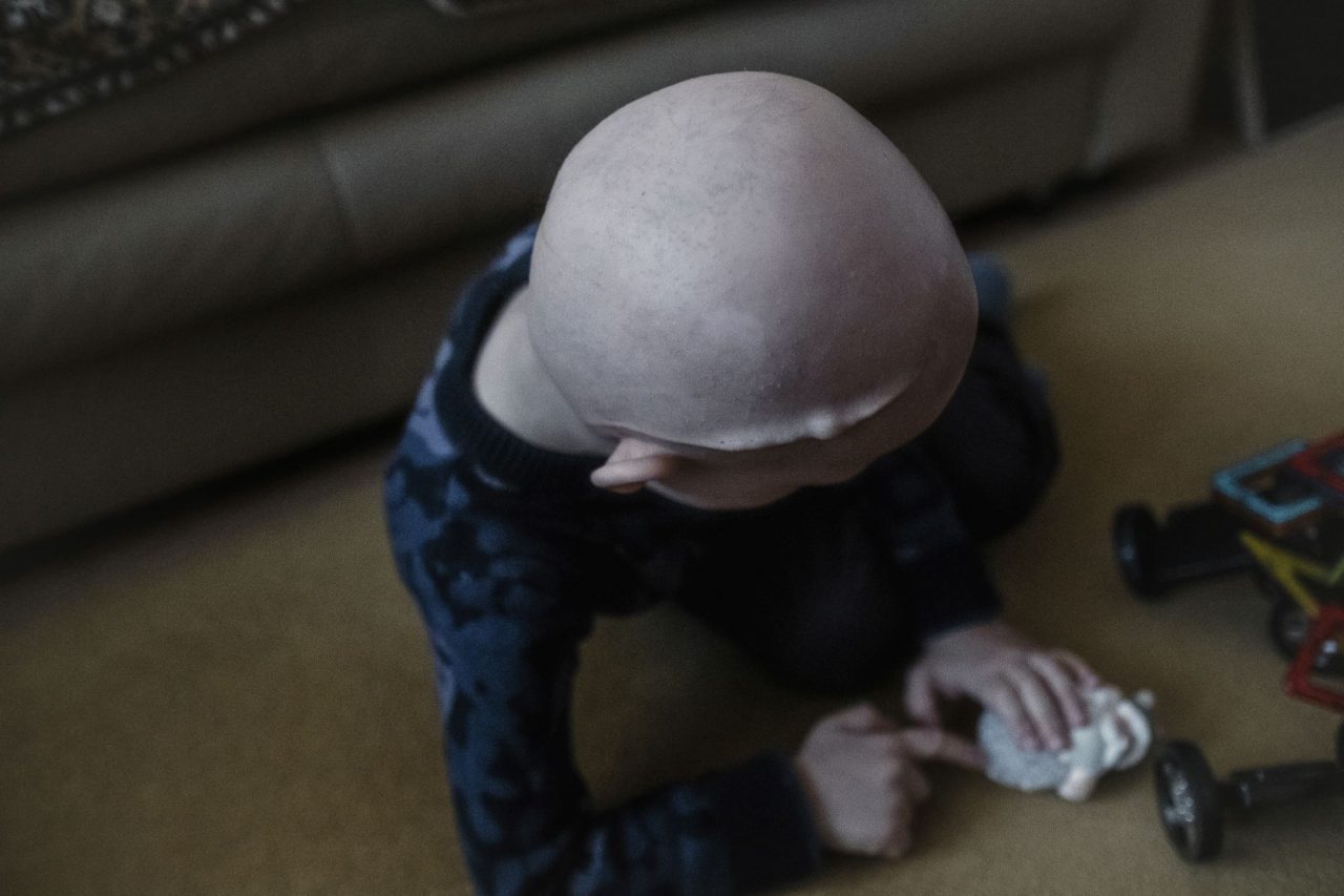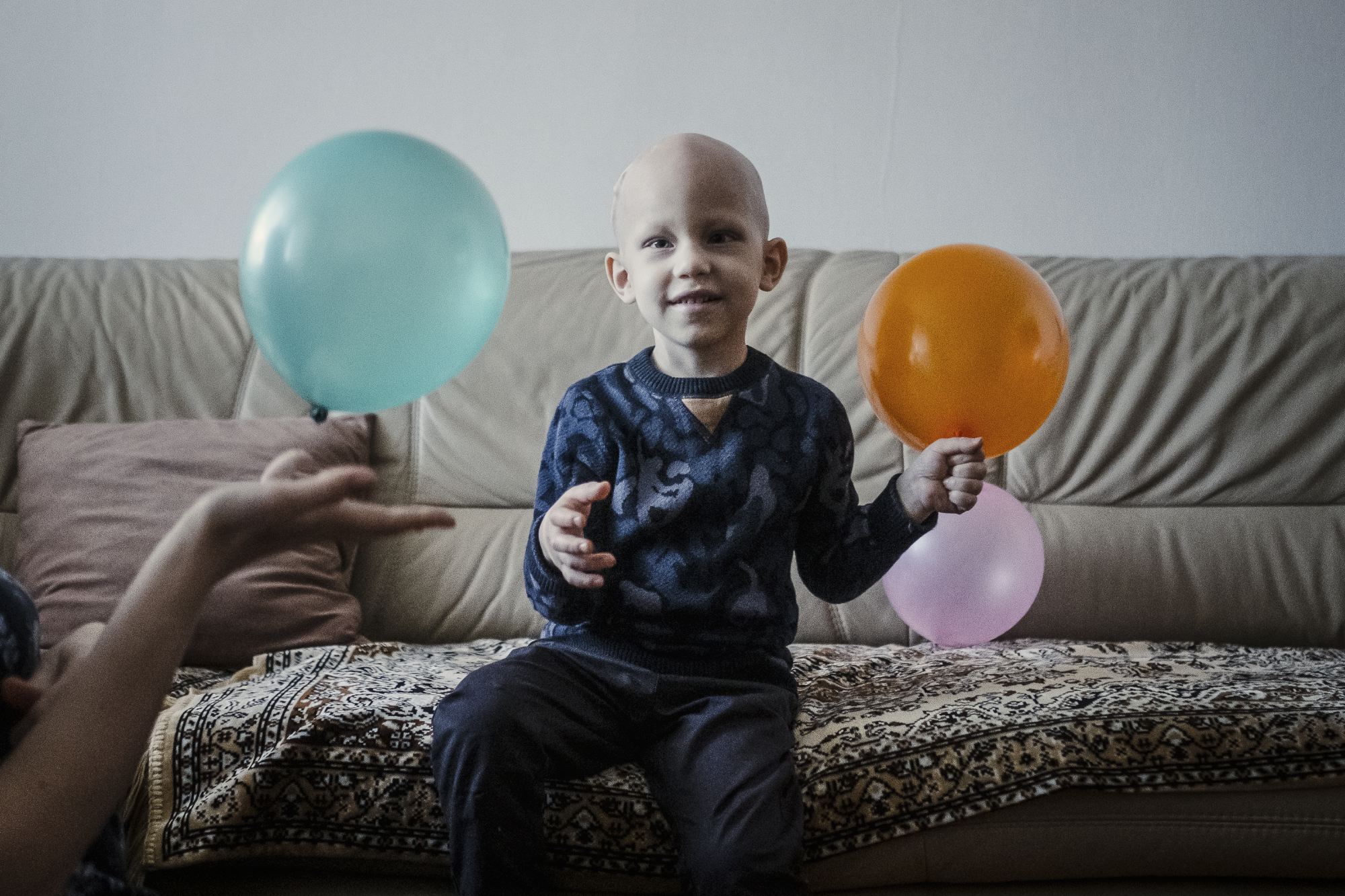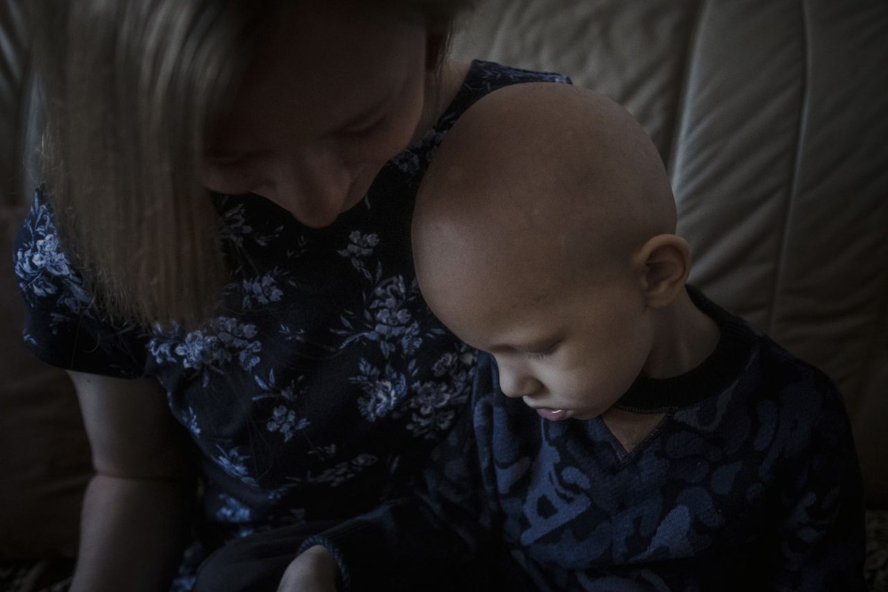 Дома Олег снимает маску и шапку. Голова его кажется совсем гладкой, но это не так: уже начинает расти первый после химиотерапии светлый, почти младенческий пушок. Он еще напоминает о болезни, как и медицинская маска и шунт — резиновая трубка, которая проходит под кожей из головы за ухом, по шее и вниз, в брюшную полость. Ее не убирают, потому что эта операция после всего, что пережил Олег, лишняя.