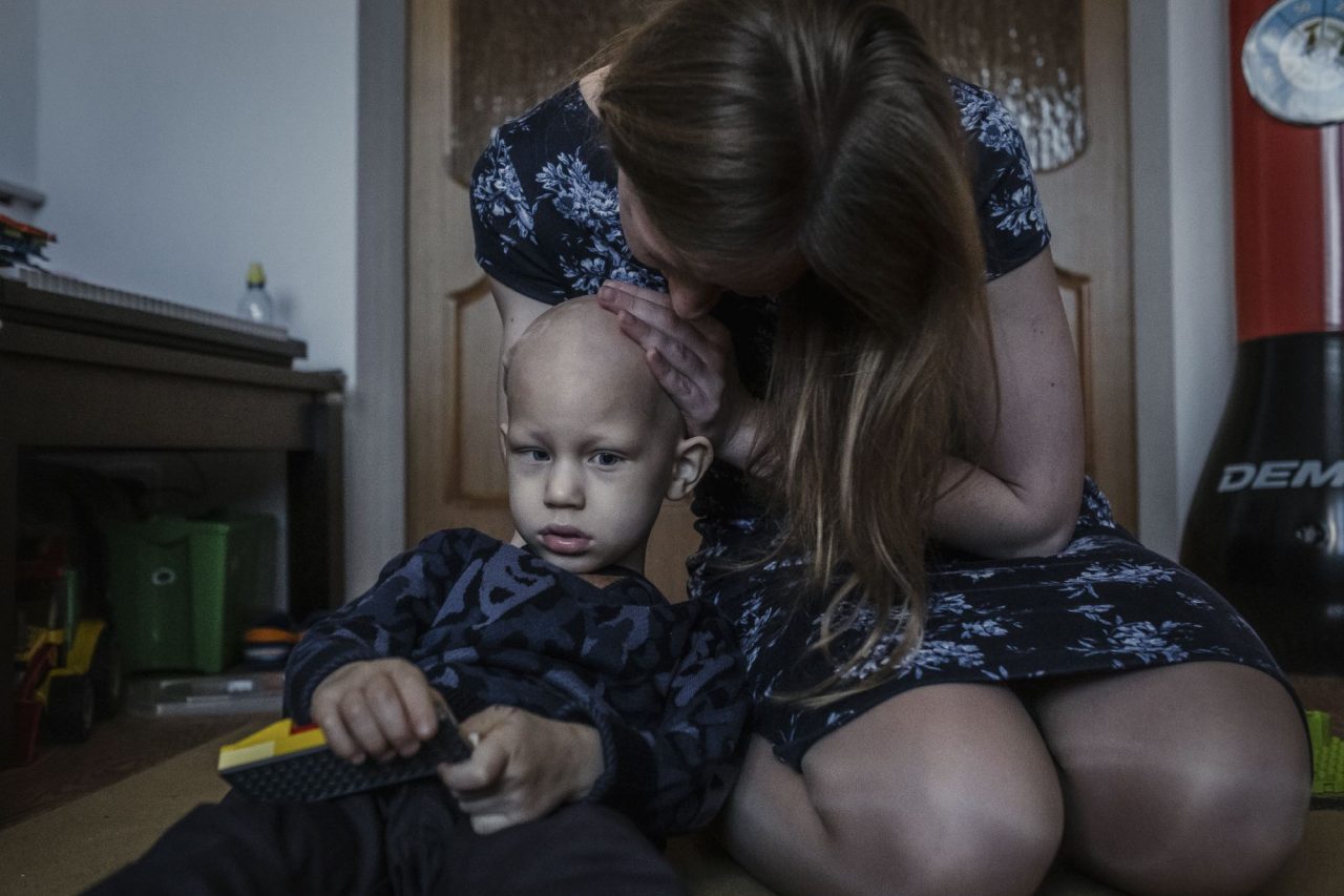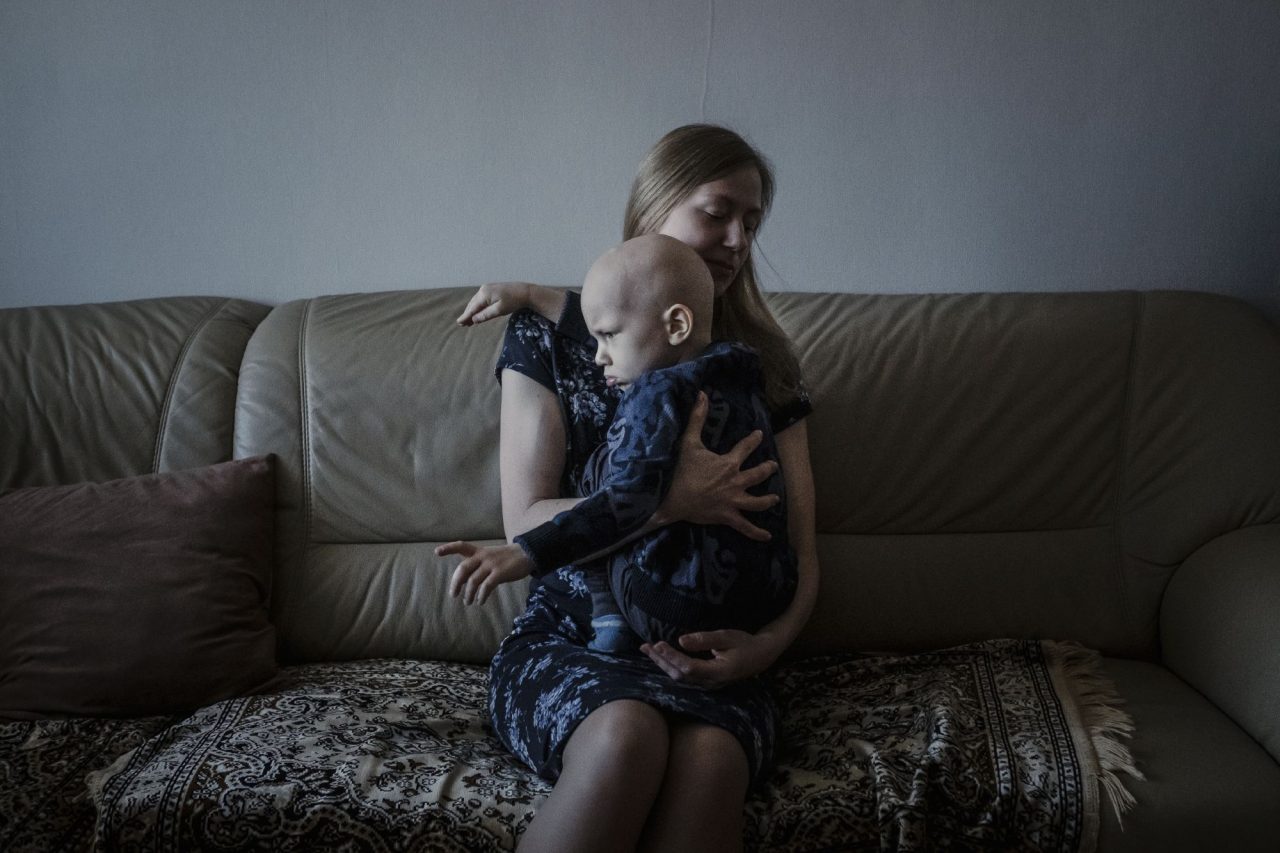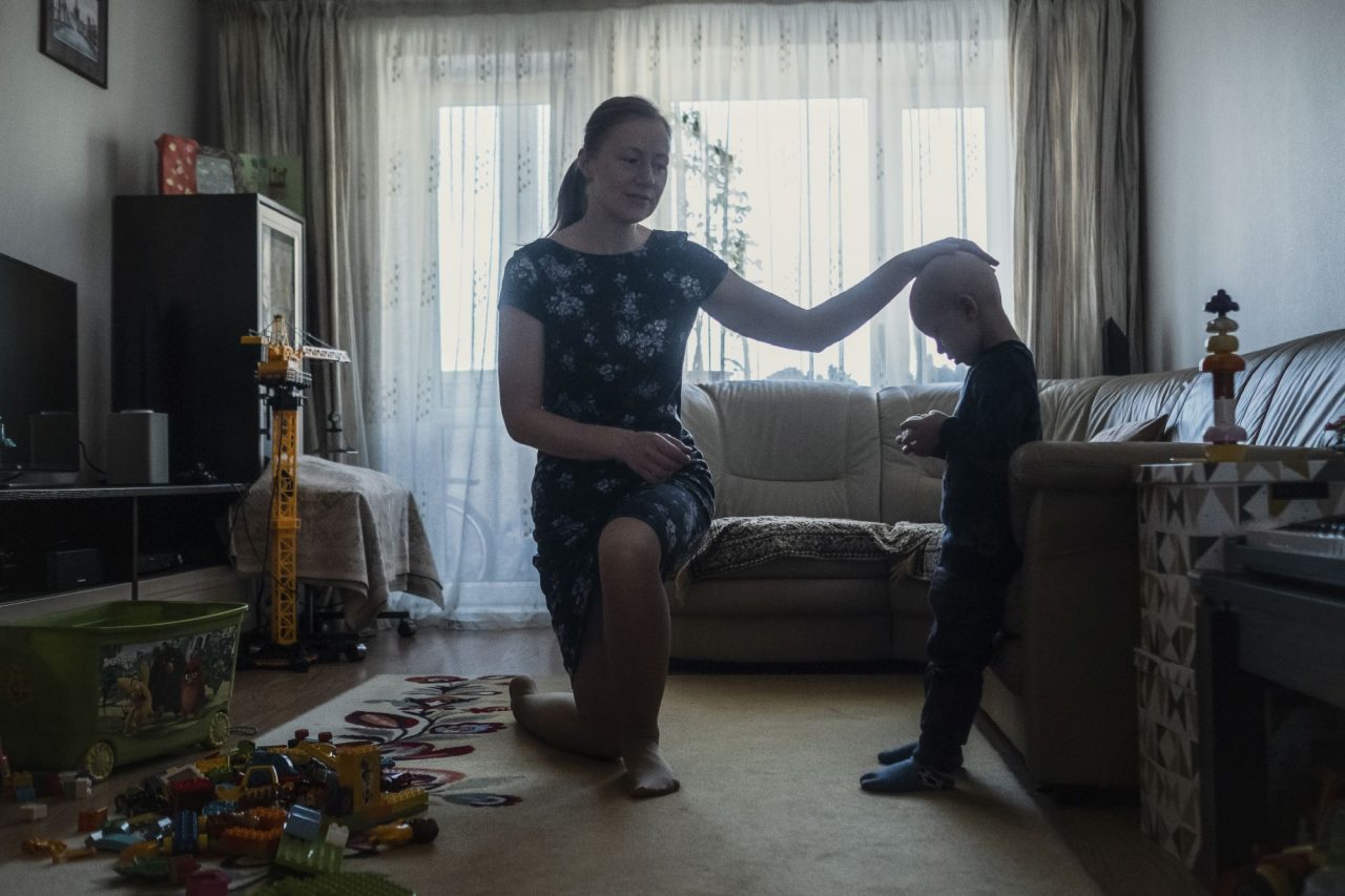 Дома Олег снимает маску и шапку. Голова его кажется совсем гладкой, но это не так: уже начинает расти первый после химиотерапии светлый, почти младенческий пушок. Он еще напоминает о болезни, как и медицинская маска и шунт — резиновая трубка, которая проходит под кожей из головы за ухом, по шее и вниз, в брюшную полость. Ее не убирают, потому что эта операция после всего, что пережил Олег, лишняя.