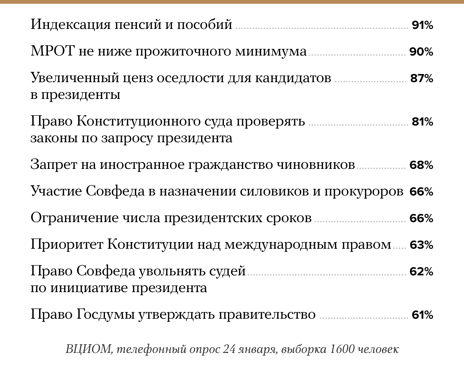 РБК опубликовал результаты опроса об отношении россиян к поправкам в Конституцию, которые предложил Владимир Путин. Опрос провел государственный Всероссийский центр изучения общественного мнения (ВЦИОМ). Согласно результатам, больше половины респондентов одобряют поправки. При этом в опросе не упоминается одно из ключевых предложений Путина — усиление роли Госсовета. «Медуза» недавно тоже провела среди читателей голосование по конституционной реформе. Одобрение получили такие поправки: ограничение числа президентских сроков, право премьера самому выбирать вице-премьеров и некоторых министров и право Госдумы утверждать правительство, запрет на иностранное гражданство для чиновников и привязка МРОТ к прожиточному минимуму.