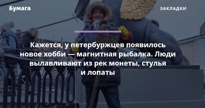 Некоторые петербуржцы стали увлекаться магнитной рыбалкой — при помощи мощных магнитов люди ищут металлические предметы на дне Фонтанки и канала Грибоедова.