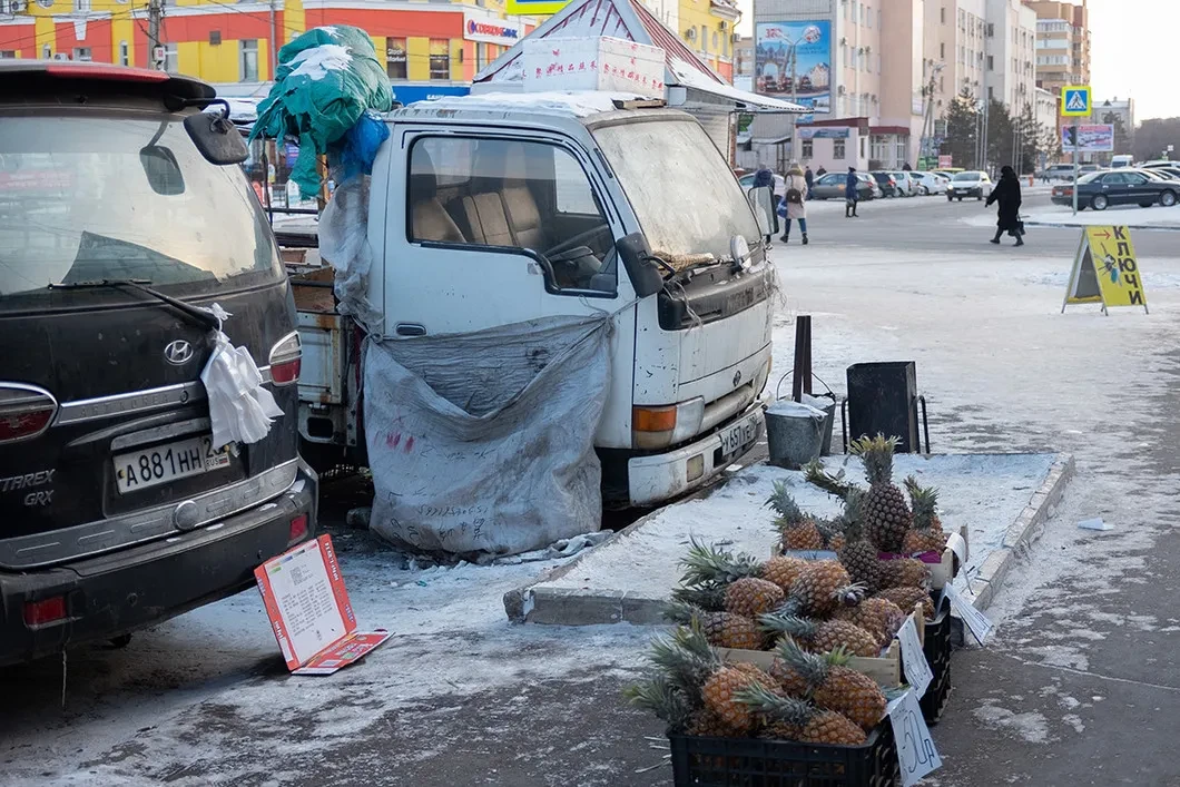 В палатках возле ТЦ тоже идет торговля. Точнее, тоже стоит. В коробках, расставленных вдоль дороги, пестреют китайские ананасы, от лотков с горячей китайской кукурузой исходит пар. Невостребованная кукуруза быстро остывает на морозе.