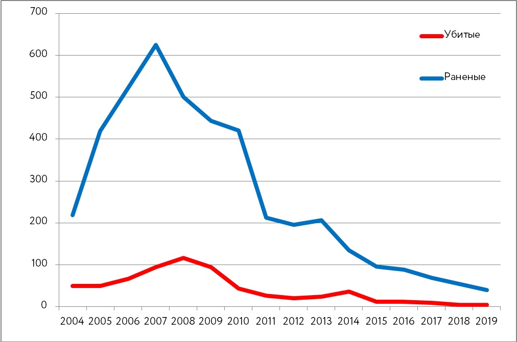 [27] Пик таких нападений пришелся на 2007 год (7 убитых, 118 раненых); с тех пор происходило постоянно снижение. После 2013 года динамика нестабильна.