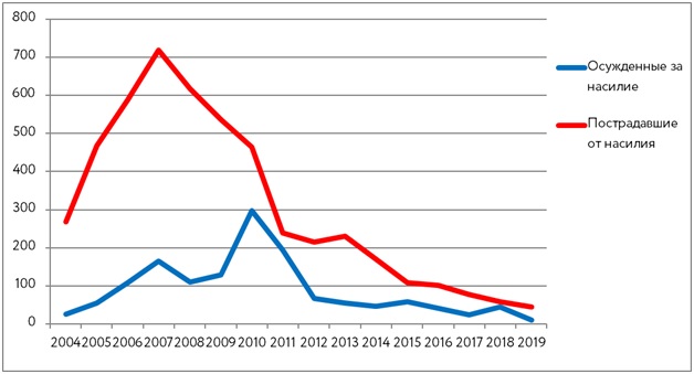 Рис. 5. Динамика потерпевших от насильственных преступлений ненависти и осужденных за такие преступления (2004–2019)