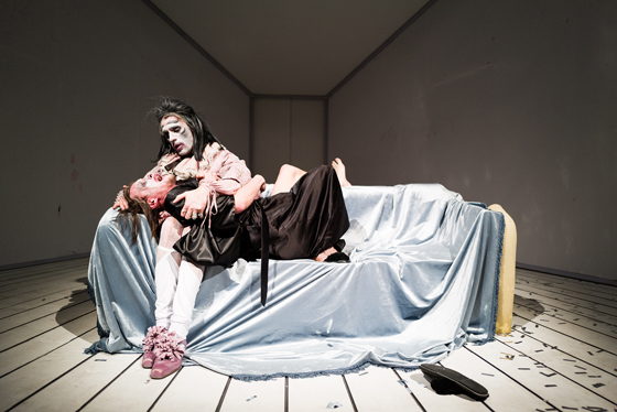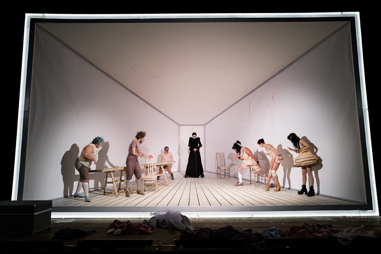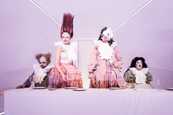 © Алиса Скальская Муравицкий поставил комедию. Для режиссера это так важно, что даже указано в полном названии спектакля — «Lё Тартюф. Комедия». Здесь все работает на общую задачу. Поэтому Луи Лебе написал музыку в духе The Tiger Lillies. Поэтому артисты освоили целый арсенал пинков, шлепков и тумаков. В спектакле они существуют в пародийной интонации «бу-бу-бу», из которой возникает настоящий грув. Режиссеру удалось собрать их не просто в ансамбль — в камерный оркестр, выступающий в балагане.