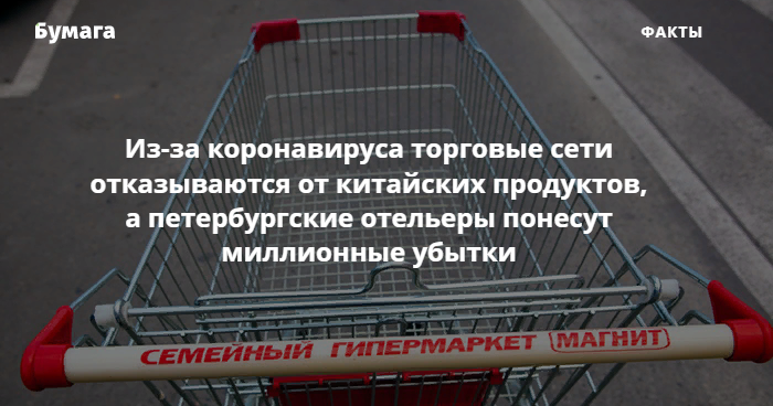 Из-за вспышки коронавируса 2019-nCoV российские торговые сети начинают отказываться от китайских продуктов. В Петербурге уже отменили несколько совместных с Китаем мероприятий, а туристическая отрасль готовится к миллионным убыткам. Эксперты опасаются дефицита смартфонов и упадка российской экономики. «Бумага» рассказывает, как из-за коронавируса могут пострадать ретейлеры, производители и потребители в Петербурге.