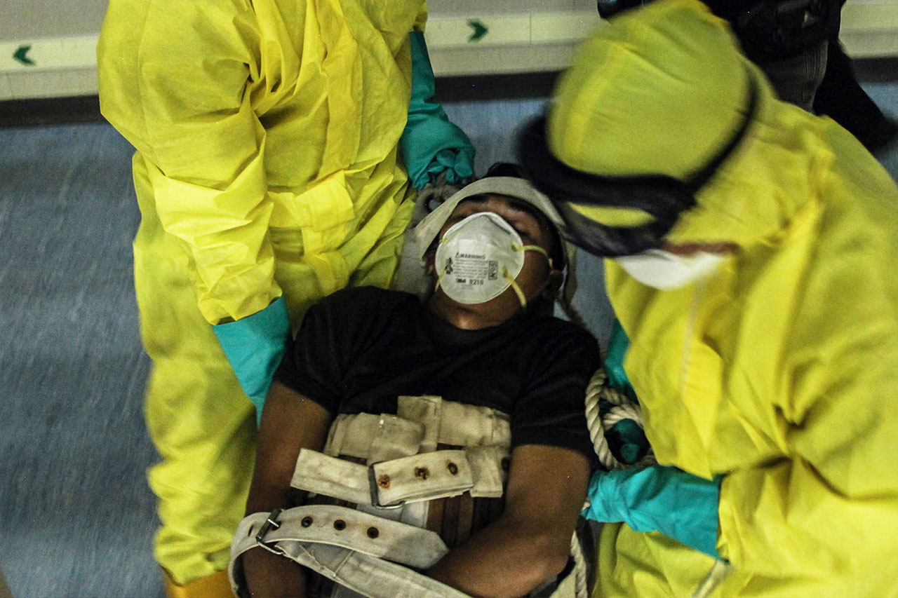 Cлужащая спецподразделения медицинских войск США по борьбе с лихорадкой Эбола проходит обучение в Сан-Антонио (Техас, США). Фото: минобороны США
