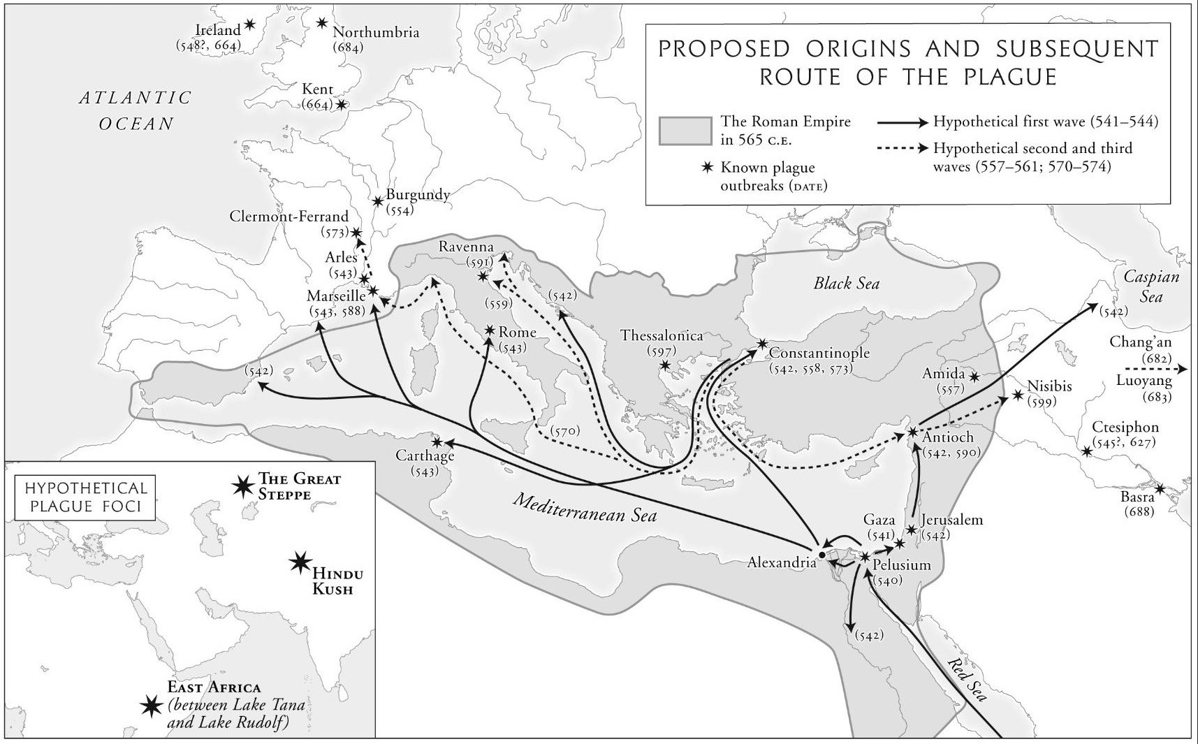 Названная в честь византийского императора Юстиниана эпидемия охватила всю бывшую Римскую империю в 540—550-е годы и убила от 25 до 100 млн человек. Эпидемия началась на высшей точке глобализации постантичного мира, когда Византийская империя объединила Ближний Восток, Северную Африку и Южную Европу. Болезнь распространилась с торговыми кораблями из Египта, который был крупнейшим экспортером пшеницы.