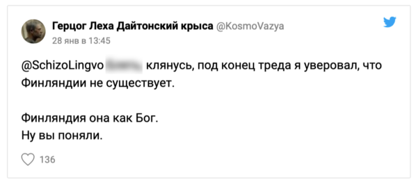 В конце января в Твиттере опубликовали тред с «аргументами» в пользу того, что Финляндии не существует. Часть пользователей поверила, что такая конспирологическая теория действительно существует, и у неё есть реальные последователи.