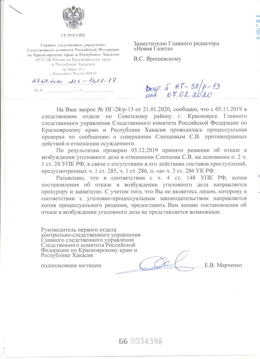 Подполковник Марченко из СК отказался представить «Новой» копию постановления об отказе в возбуждении уголовного дела, сославшись на УПК. Поэтому можем опираться только на неофициальные источники.